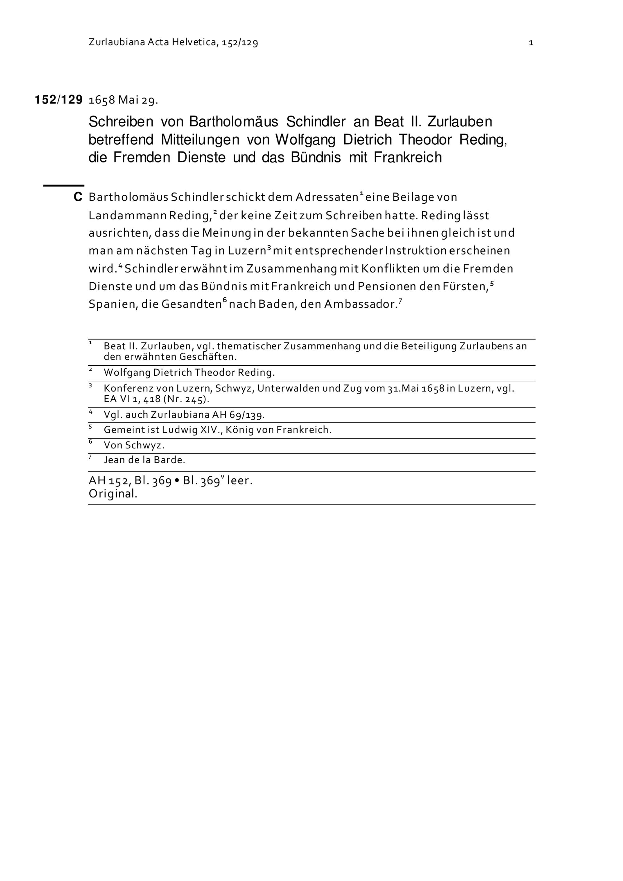 Schreiben von Bartholomäus Schindler an Beat II. Zurlauben betreffend Mitteilungen von Wolfgang Dietrich Theodor Reding, die Fremden Dienste und das Bündnis mit Frankreich