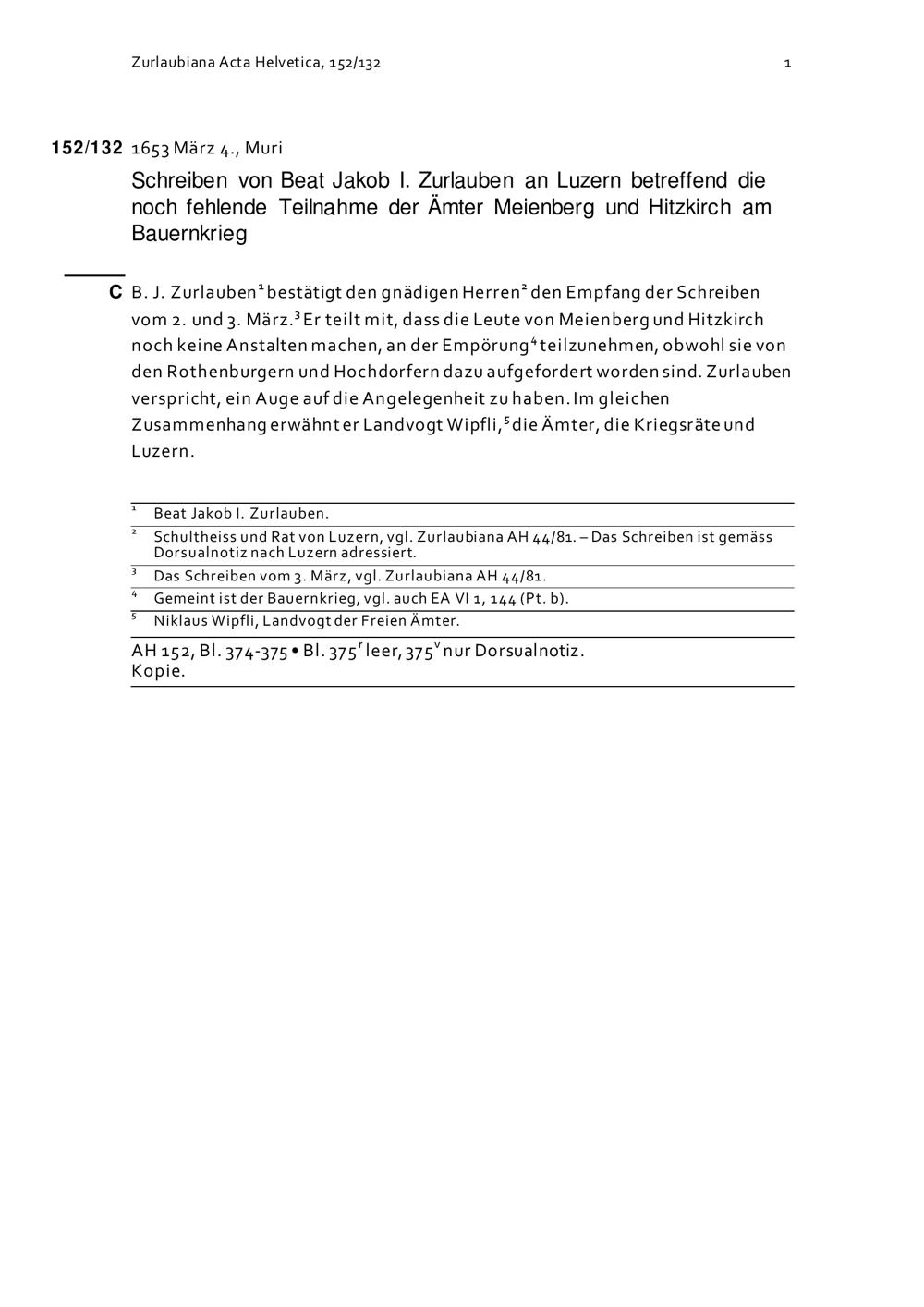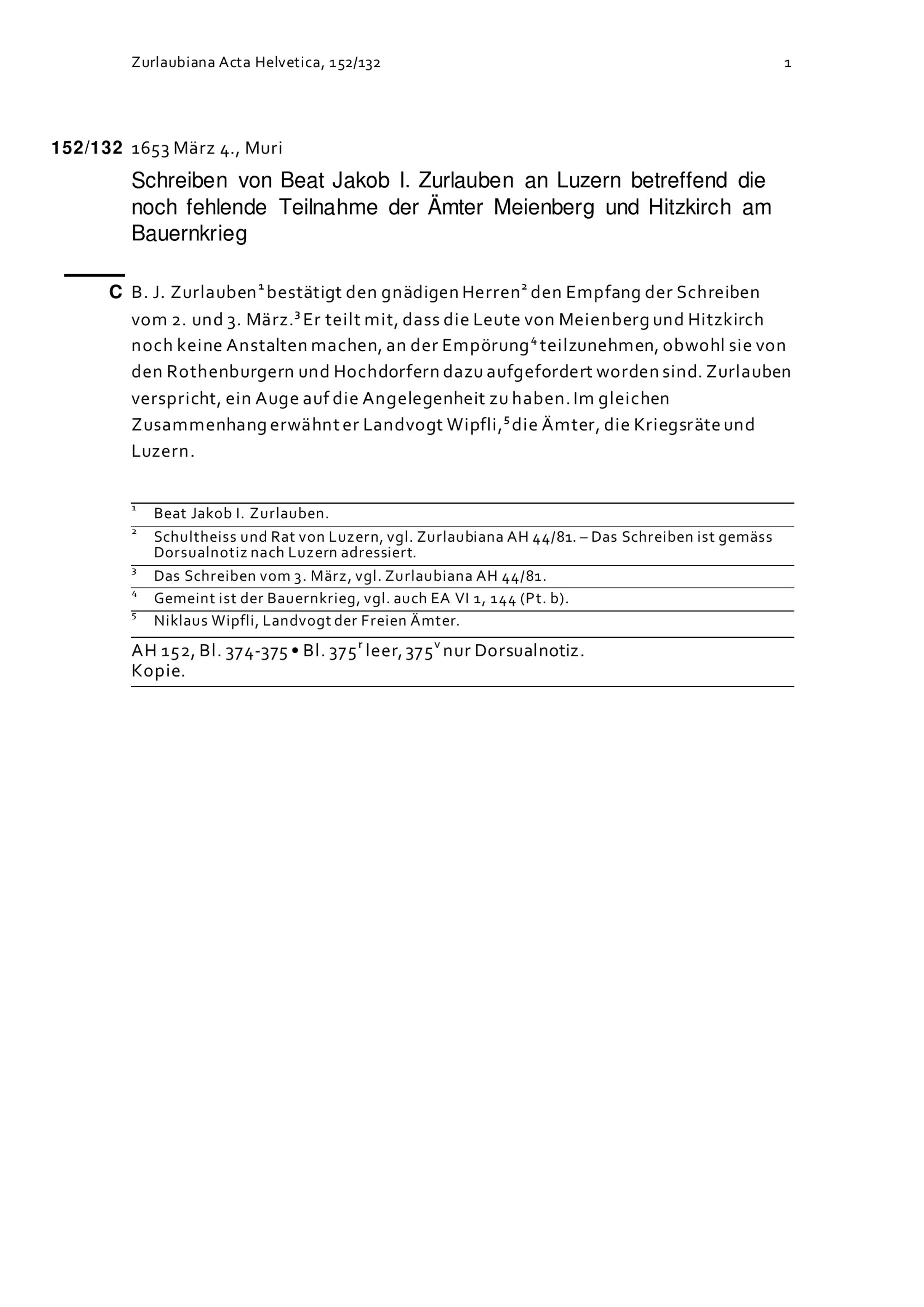 Schreiben von Beat Jakob I. Zurlauben an Luzern betreffend die noch fehlende Teilnahme der Ämter Meienberg und Hitzkirch am Bauernkrieg