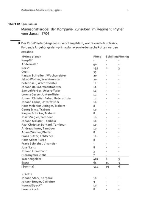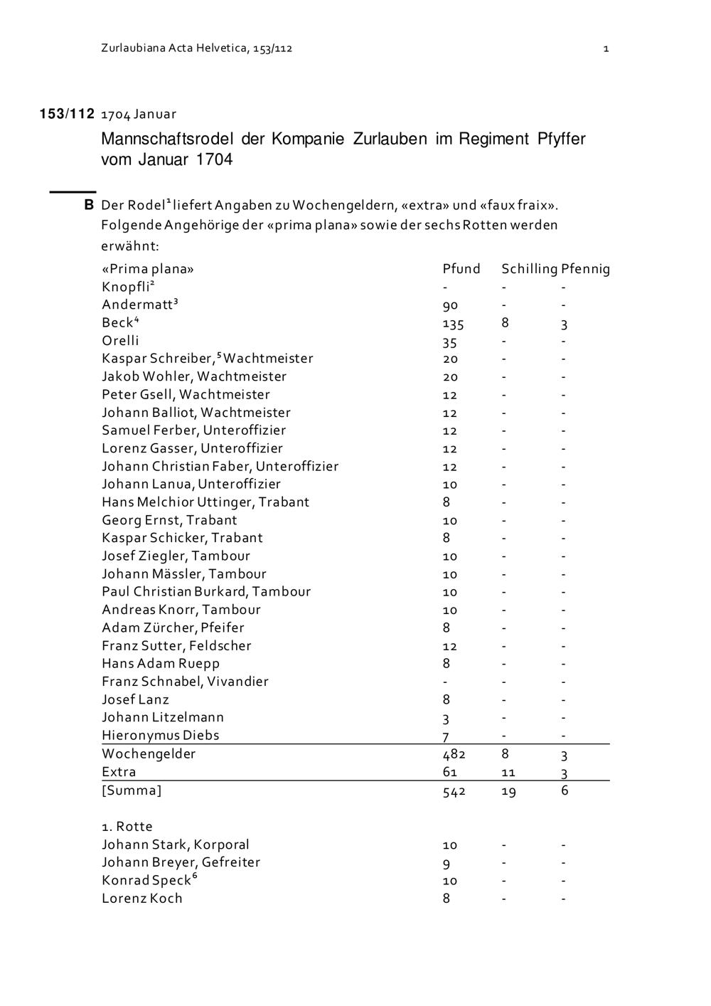 Mannschaftsrodel der Kompanie Zurlauben im Regiment Pfyffer vom Januar 1704