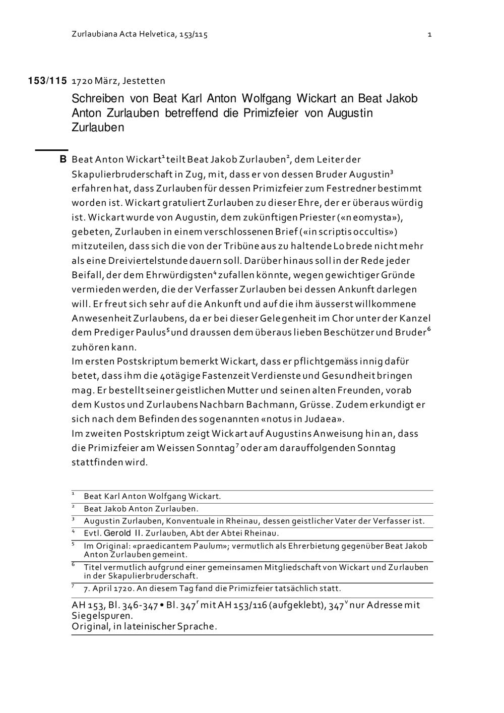 Schreiben von Beat Karl Anton Wolfgang Wickart an Beat Jakob Anton Zurlauben betreffend die Primizfeier von Augustin Zurlauben