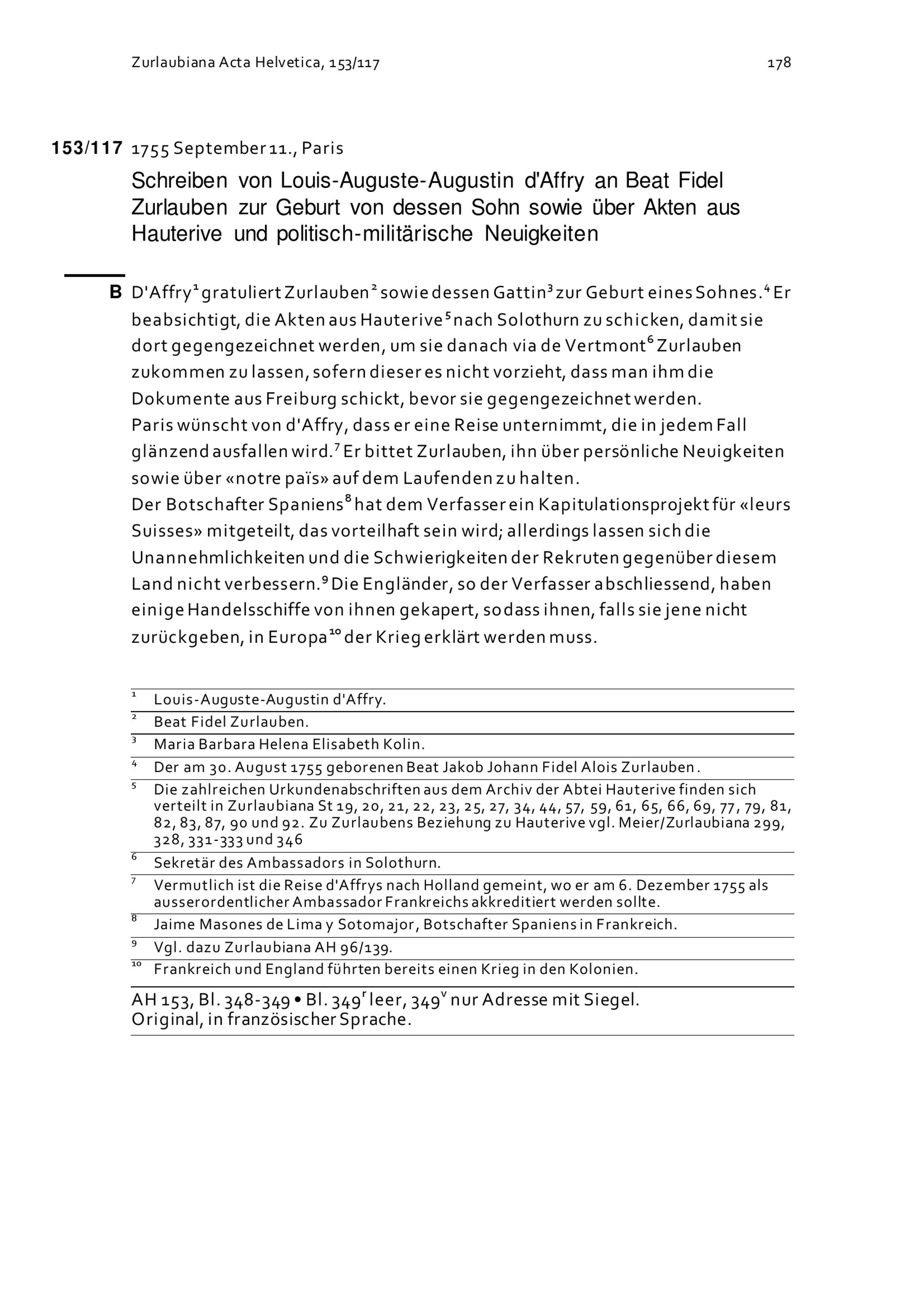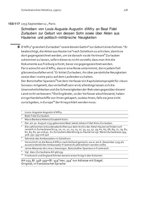 Schreiben von Louis-Auguste-Augustin d'Affry an Beat Fidel Zurlauben zur Geburt von...