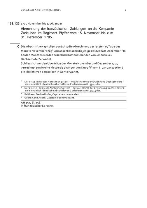 Abrechnung der französischen Zahlungen an die Kompanie Zurlauben im Regiment Pfyffer vom 15. November bis zum 31. Dezember 1705
