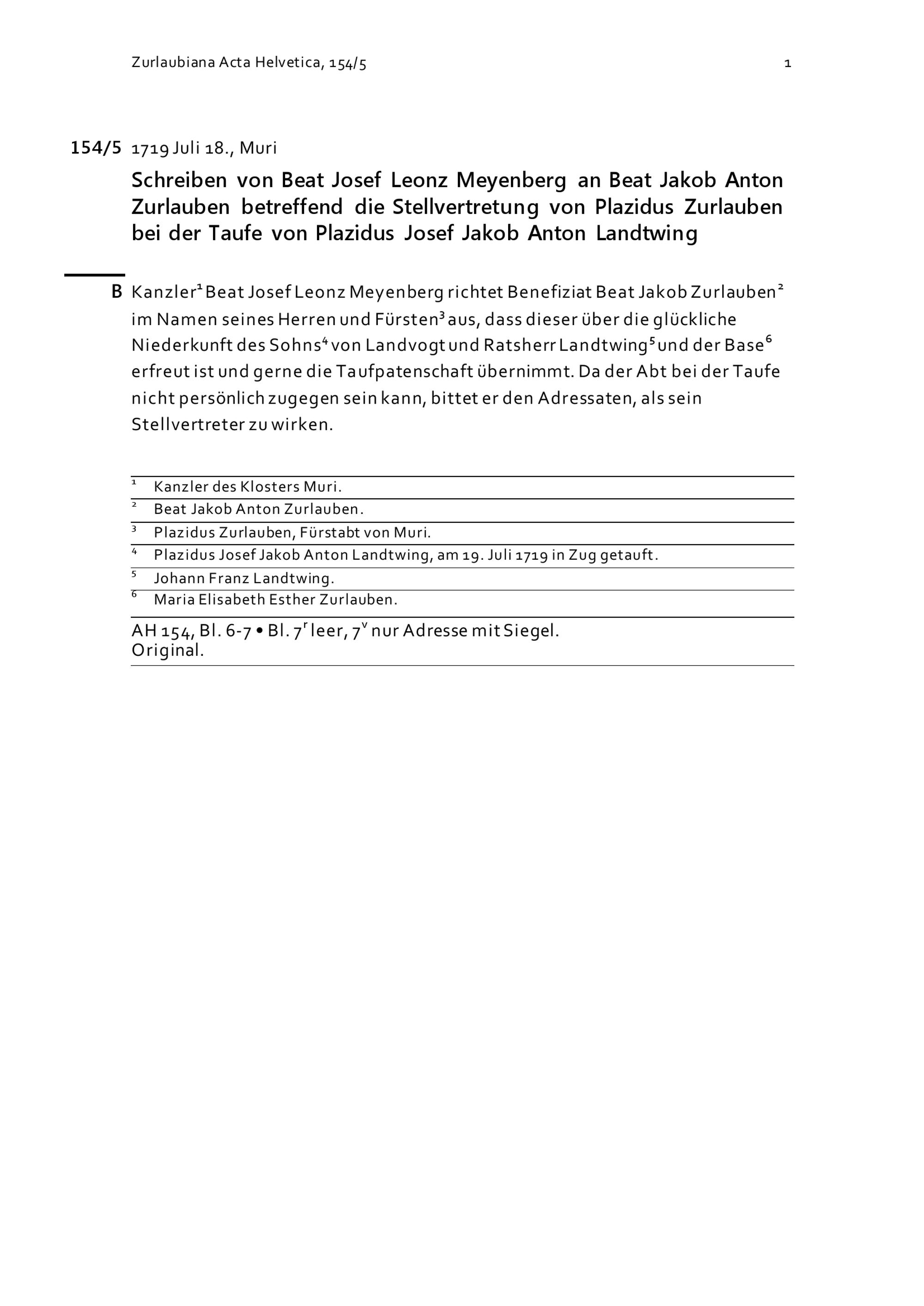 Schreiben von Beat Josef Leonz Meyenberg an Beat Jakob Anton Zurlauben betreffend die Stellvertretung von Plazidus Zurlauben bei der Taufe von Plazidus Josef Jakob Anton Landtwing