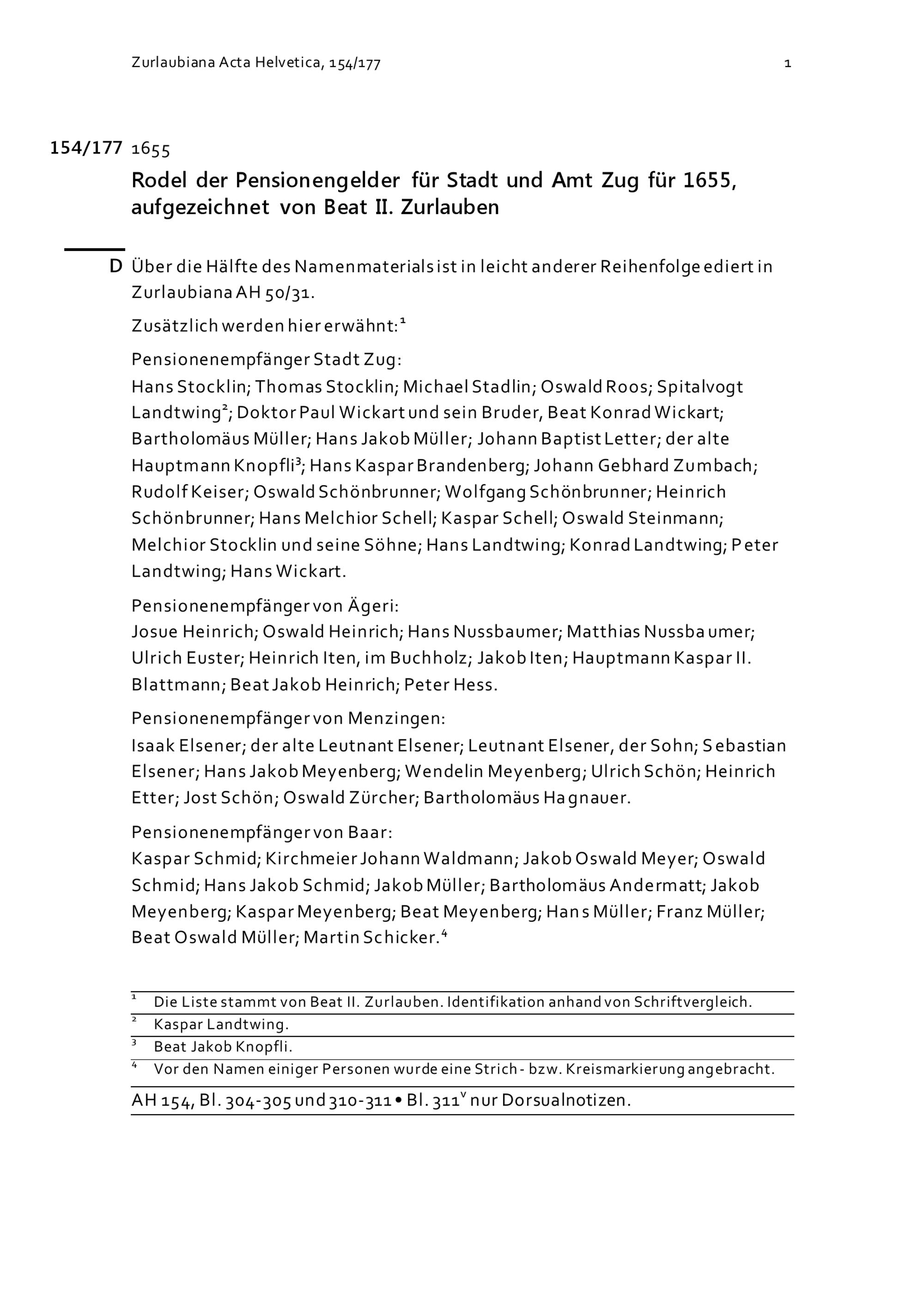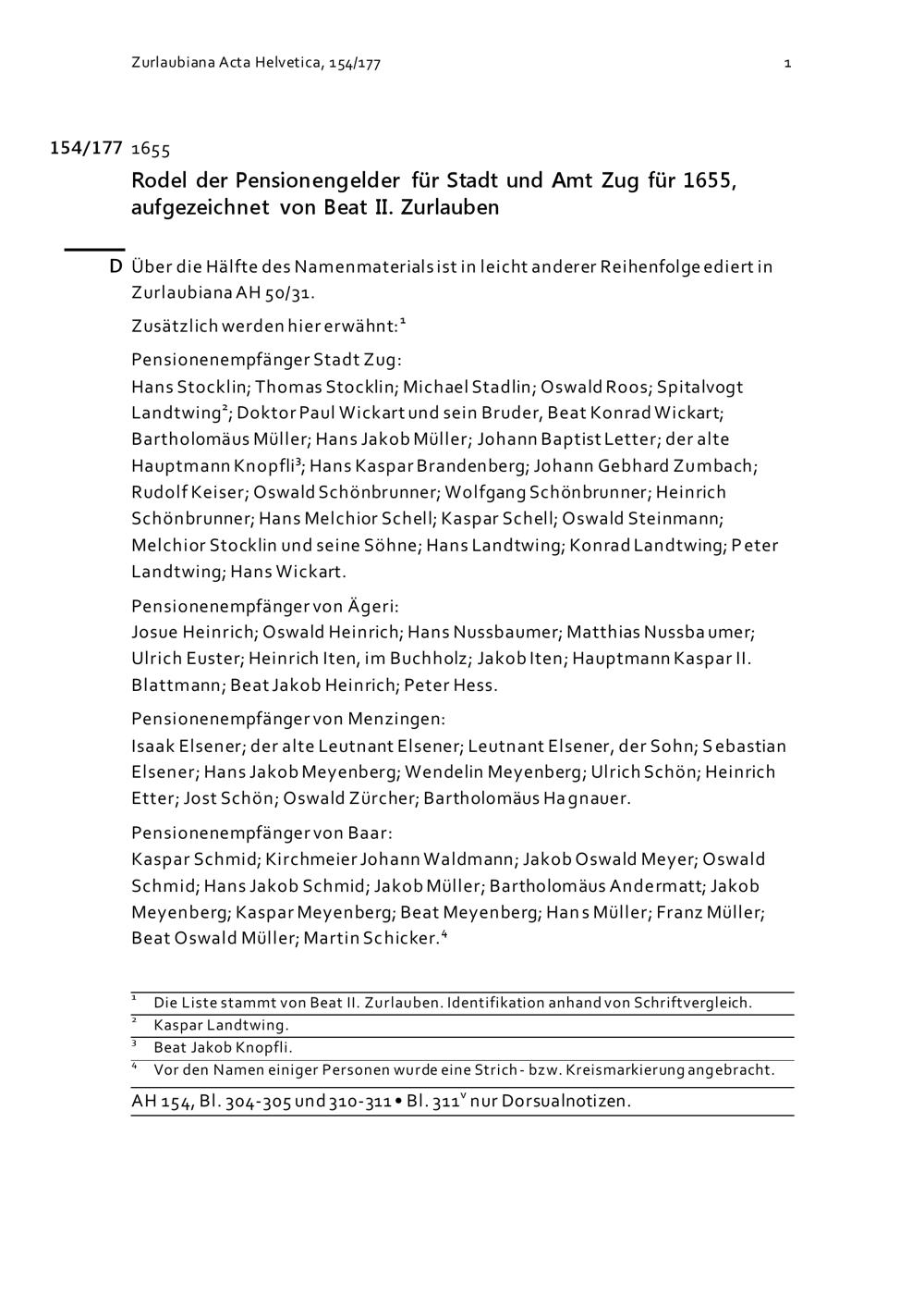 Rodel der Pensionengelder für Stadt und Amt Zug für 1655, aufgezeichnet von Beat...