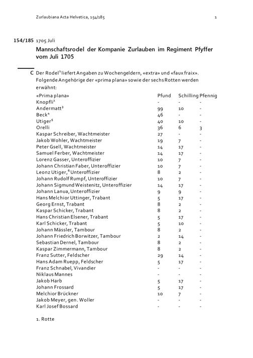 Mannschaftsrodel der Kompanie Zurlauben im Regiment Pfyffer vom Juli 1705