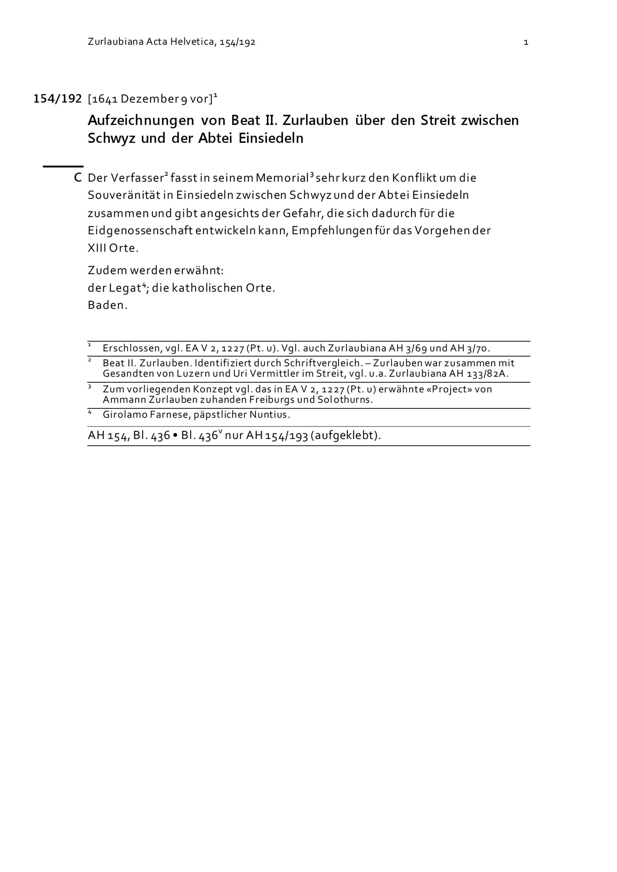 Aufzeichnungen von Beat II. Zurlauben über den Streit zwischen Schwyz und der Abtei Einsiedeln