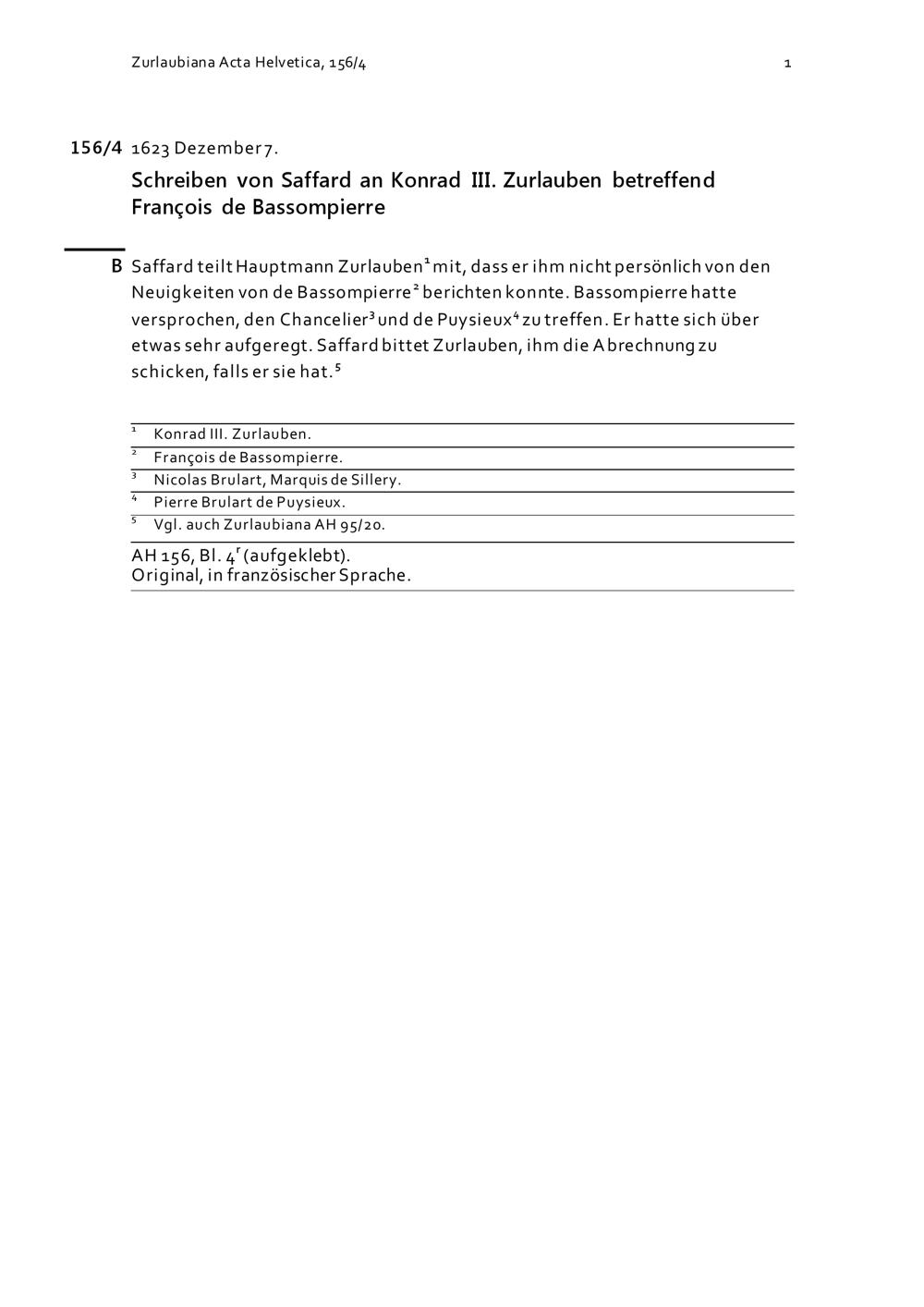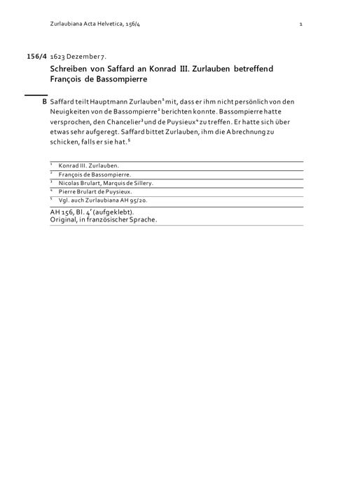 Schreiben von NN Saffard an Konrad III. Zurlauben betreffend François de Bassompierre