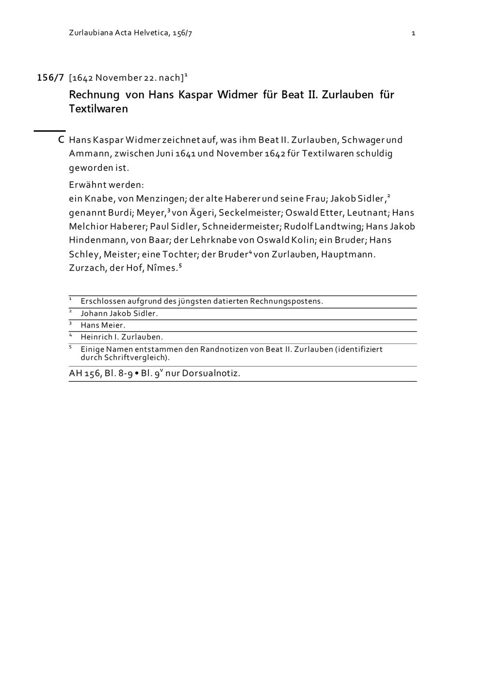 Rechnung von Hans Kaspar Widmer für Beat II. Zurlauben für Textilwaren