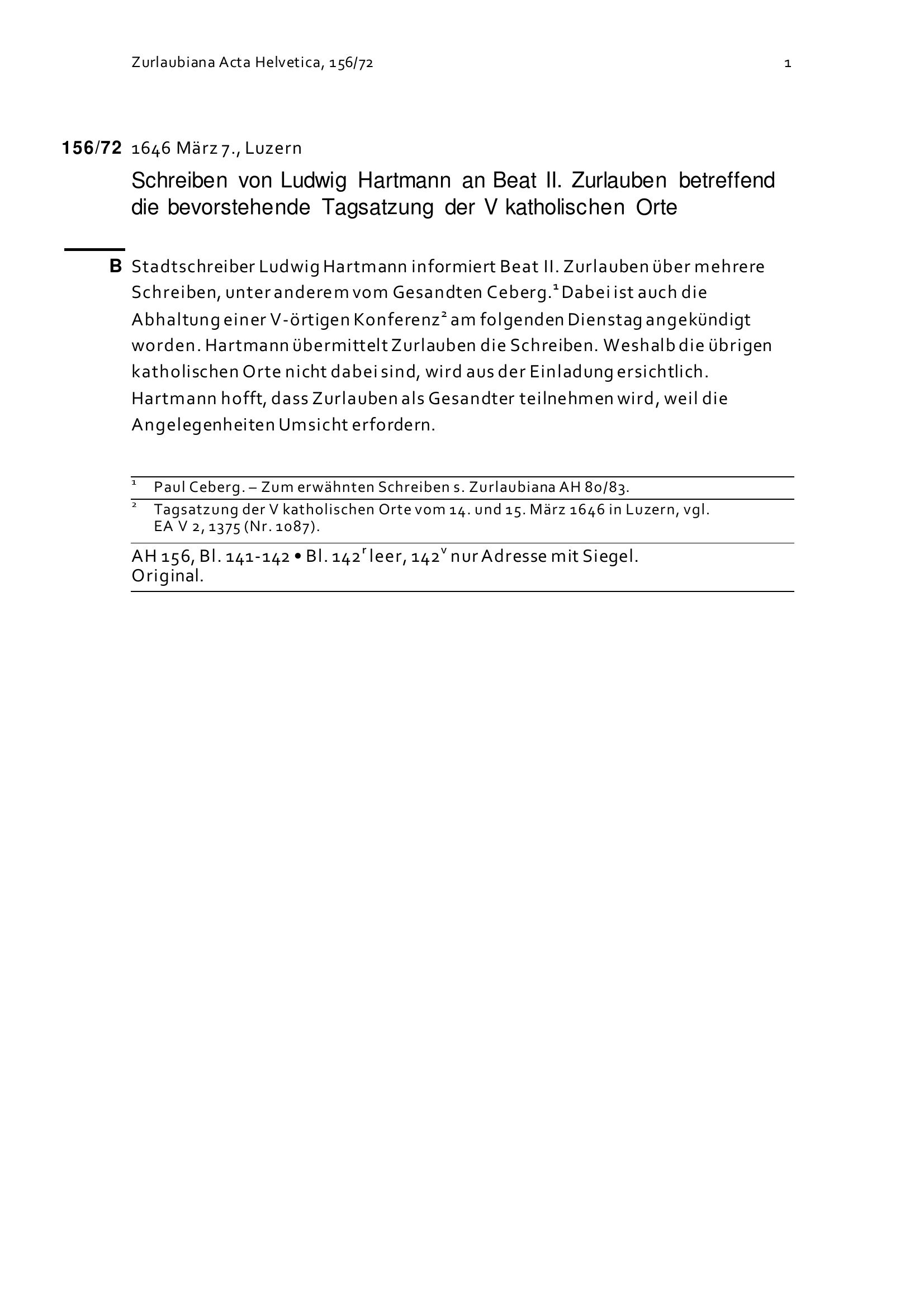 Schreiben von Ludwig Hartmann an Beat II. Zurlauben betreffend die bevorstehende Tagsatzung der Fünf Katholischen Orte