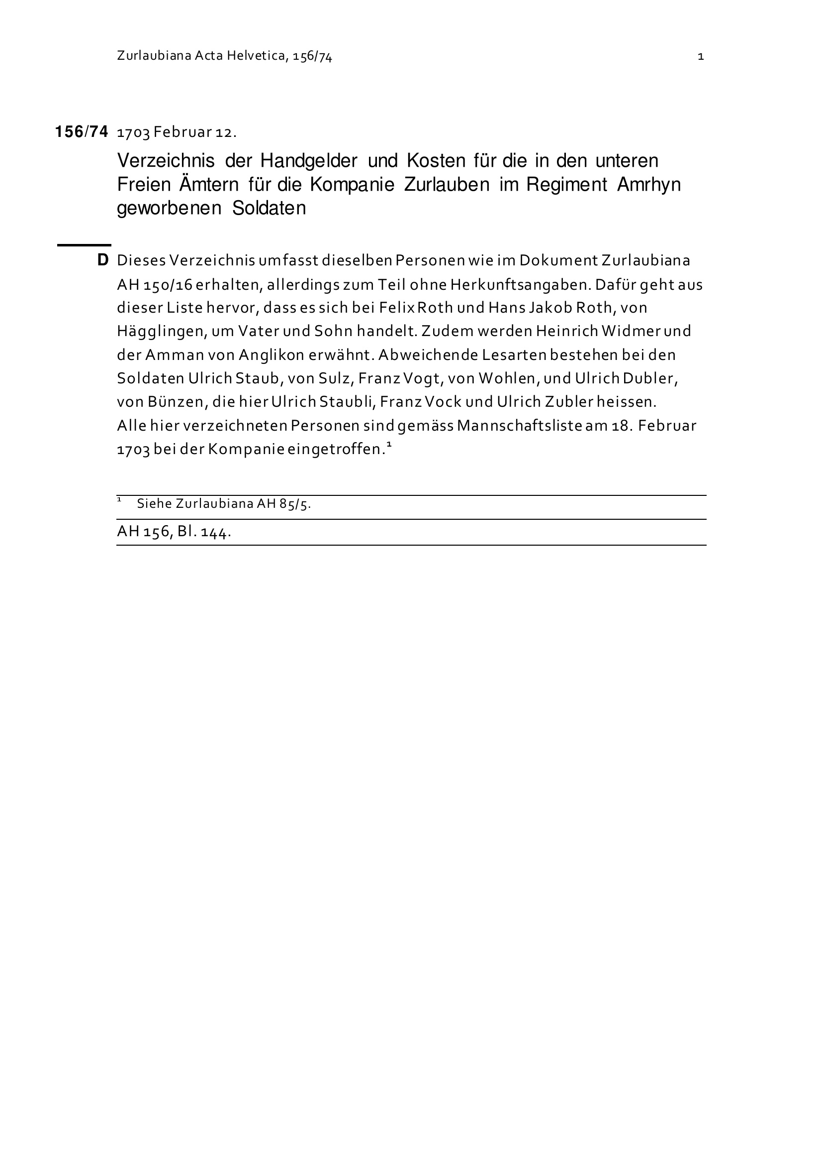 Verzeichnis der Handgelder und Kosten für die in den unteren Freien Ämter für die Kompanie Zurlauben im Regiment Amrhyn geworbenen Soldaten