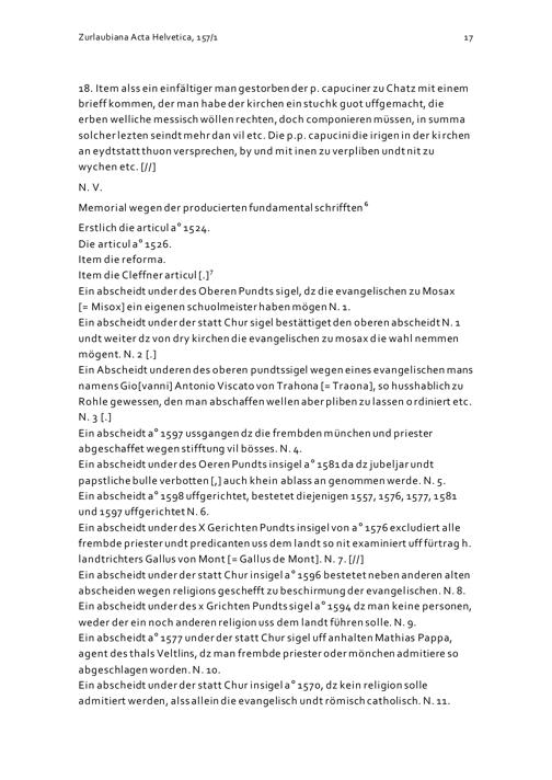 Abschied der Konferenz der Sechs Eidgenössischen Orte Zürich, Bern, Luzern, Uri, Schwyz und Neugläubig Glarus vom 5. bis 13. April 1644 in Chur zur Vermittlung in den Bündner Wirren, samt folgenden Beilagen: Beschwerden der Katholiken gegen die Protestanten, Replik der Protestanten darauf, Beschwerden der Protestanten gegen die Katholiken, Beschwerden gegen die Kapuziner, Verzeichnis der für die Beilegung der Auseinandersetzung wichtigen Dokumente und Urkunden