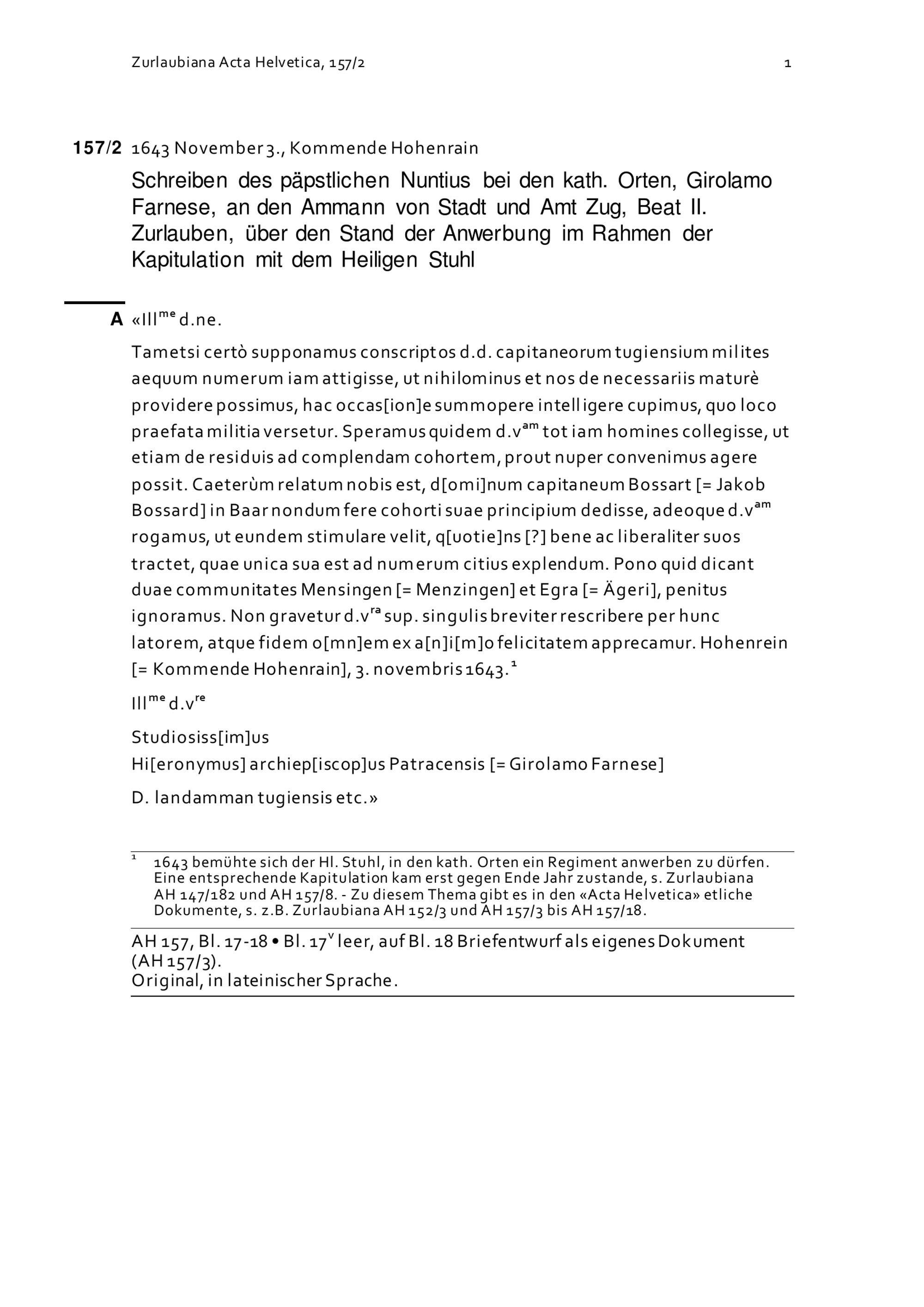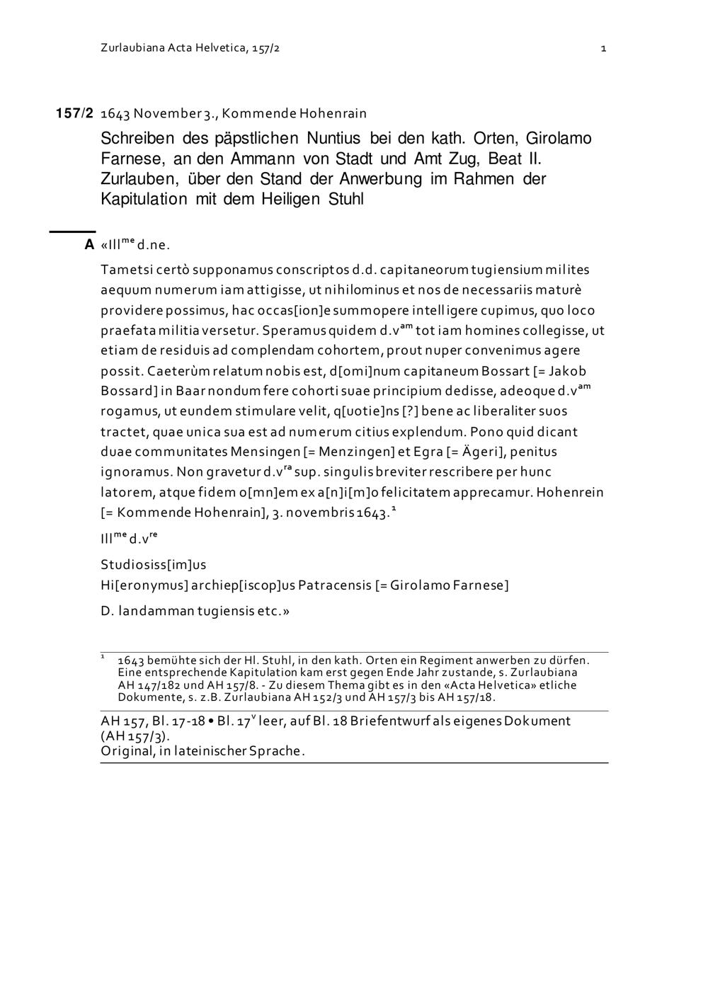 Schreiben von Girolamo Farnese, Nuntius, an Beat II. Zurlauben, Ammann, über den...