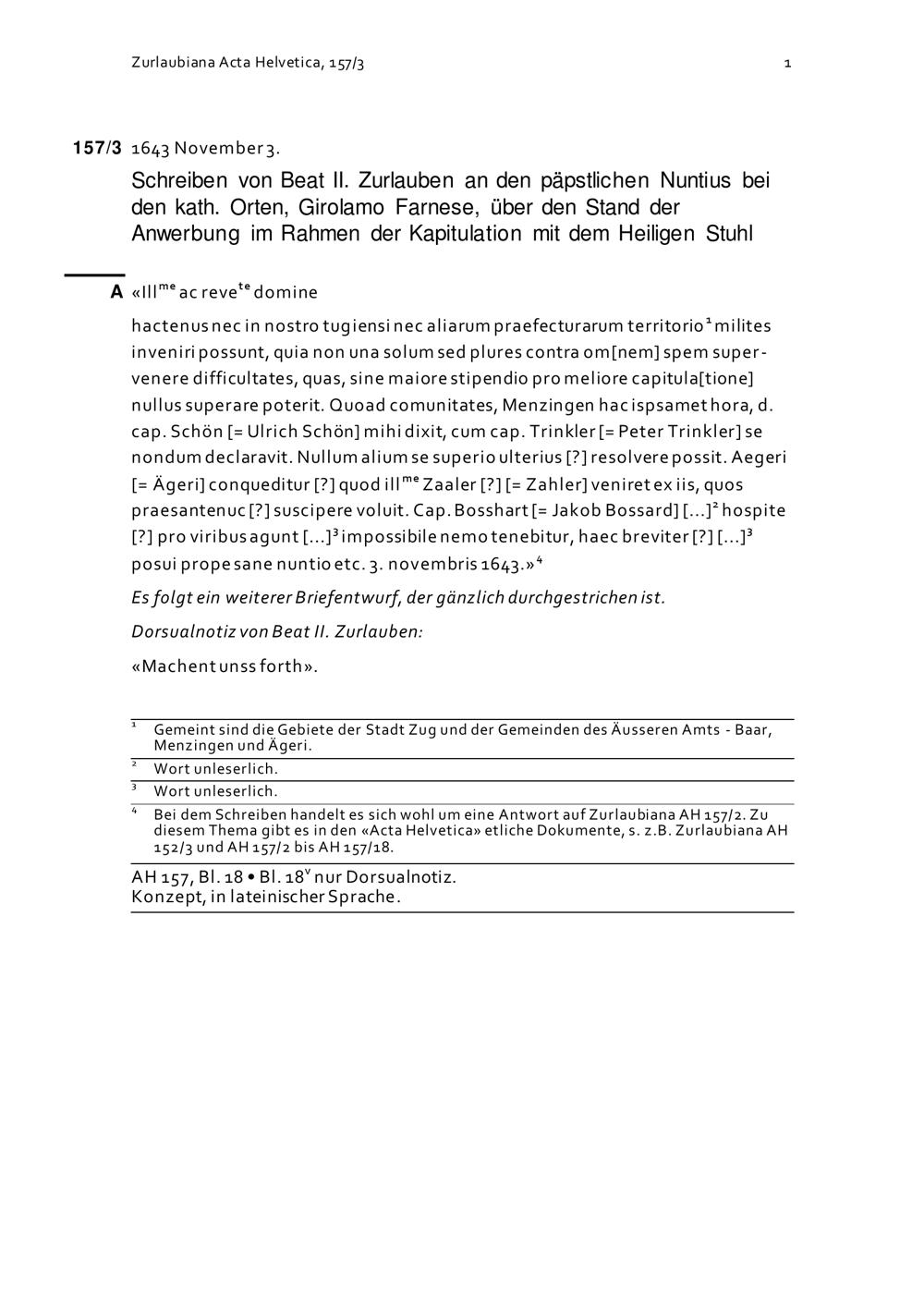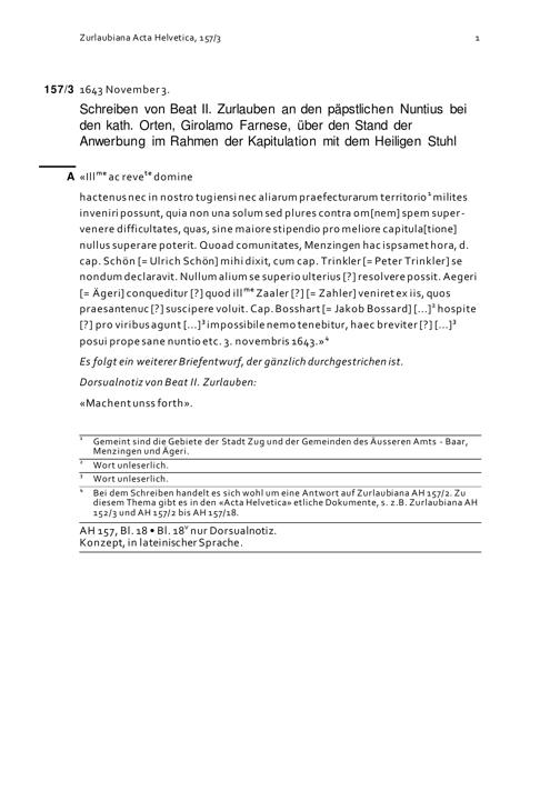 Schreiben von Beat II. Zurlauben an Girolamo Farnese, Nuntius, über den Stand der...