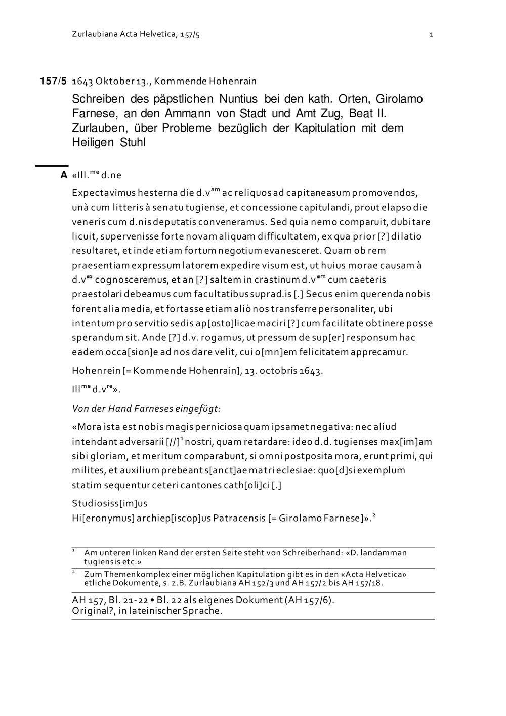 Schreiben von Girolamo Farnese, Nuntius, an Beat II. Zurlauben, Ammann, über Probleme bezüglich der Kapitulation mit dem Heiligen Stuhl
