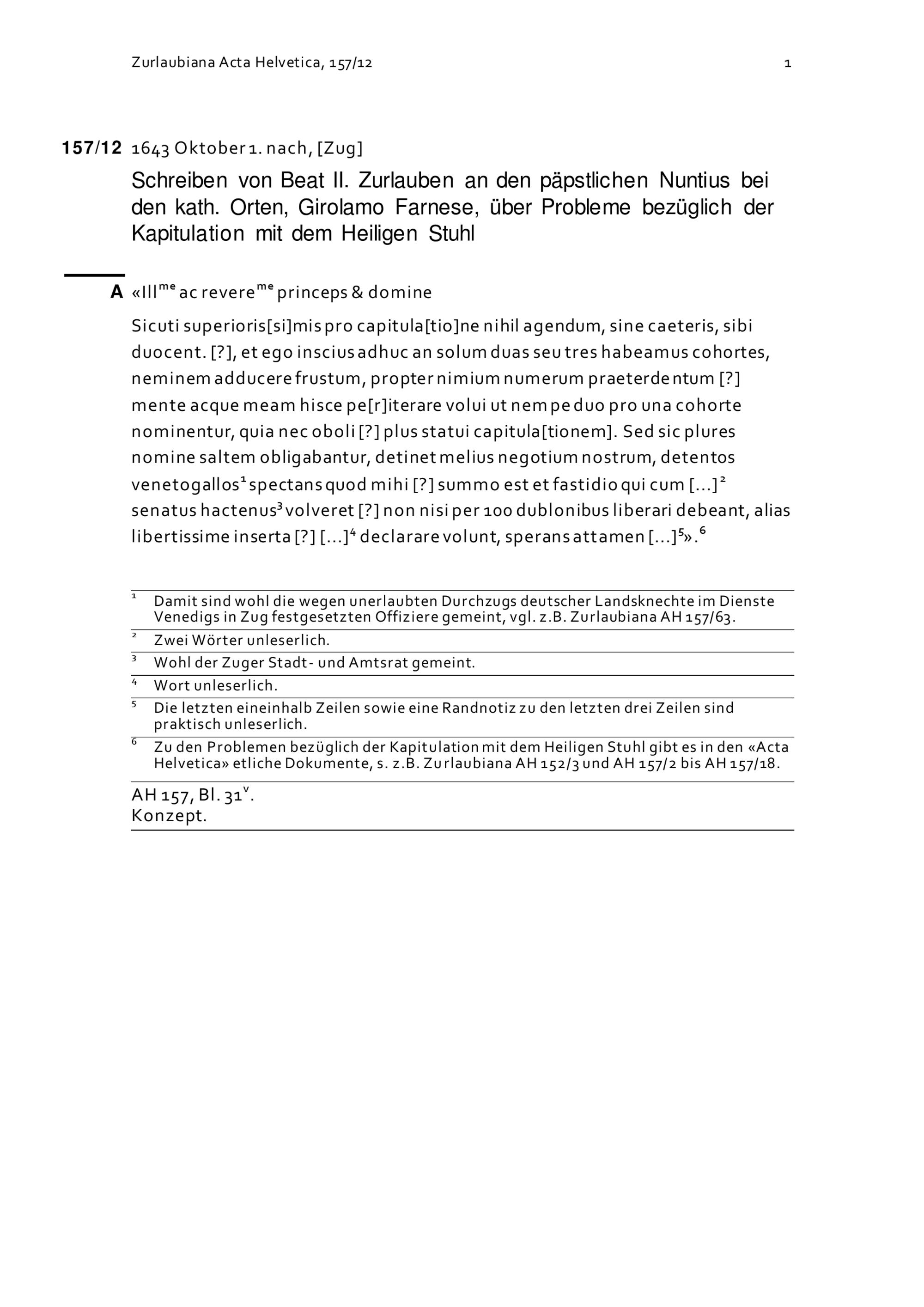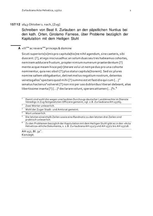 Schreiben von Beat II. Zurlauben an Girolamo Farnese, Nuntius, über Probleme bezüglich der Kapitulation mit dem Heiligen Stuhl