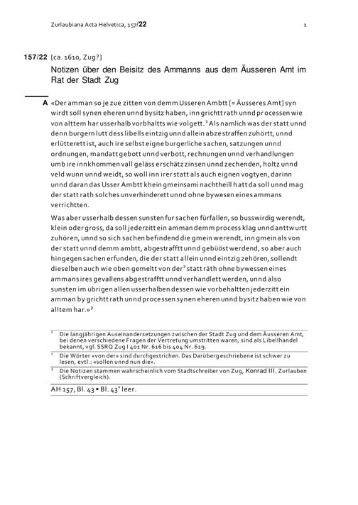 Notiz über den Beisitz des Ammanns aus dem Äusseren Amt im Rat der Stadt Zug