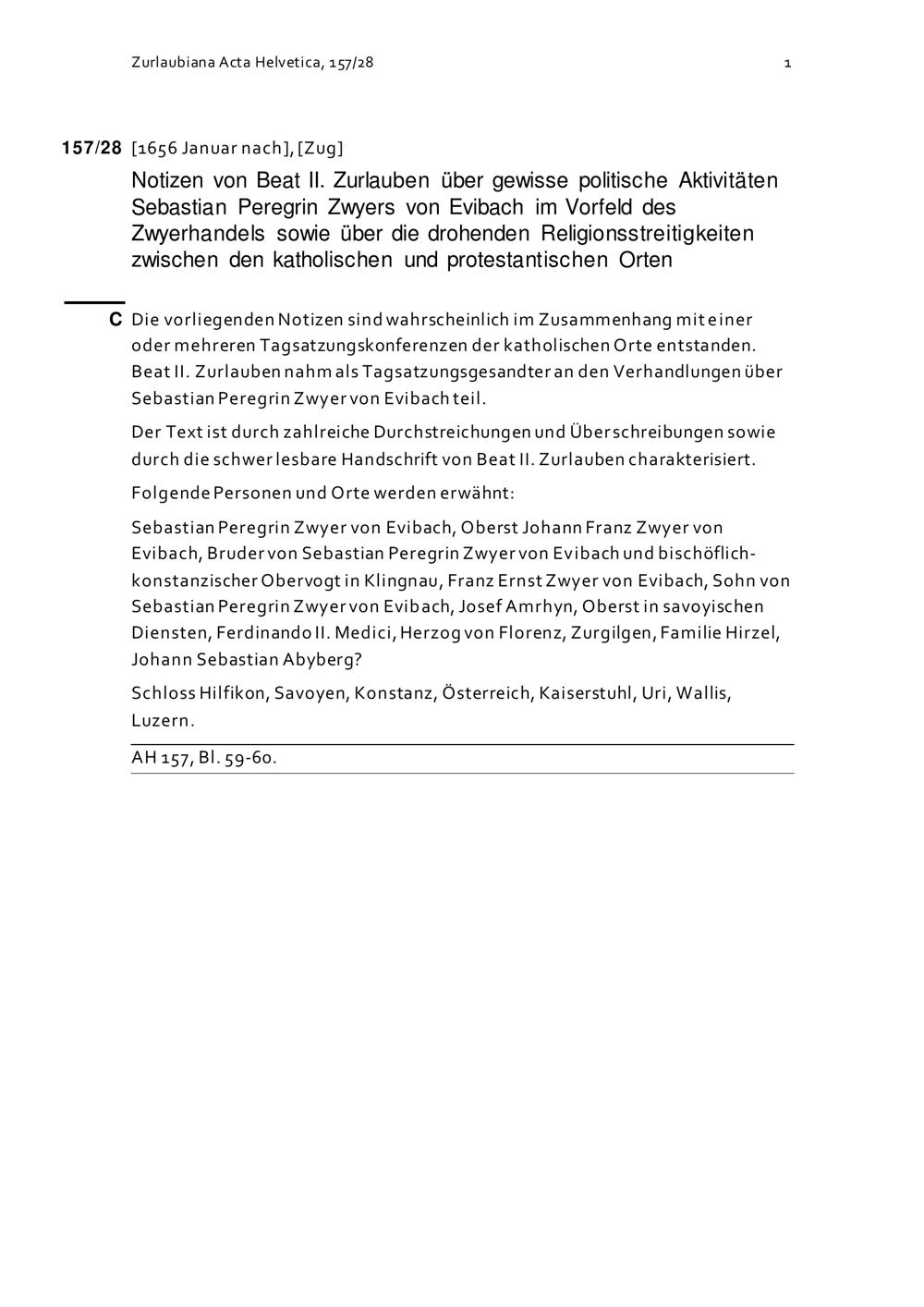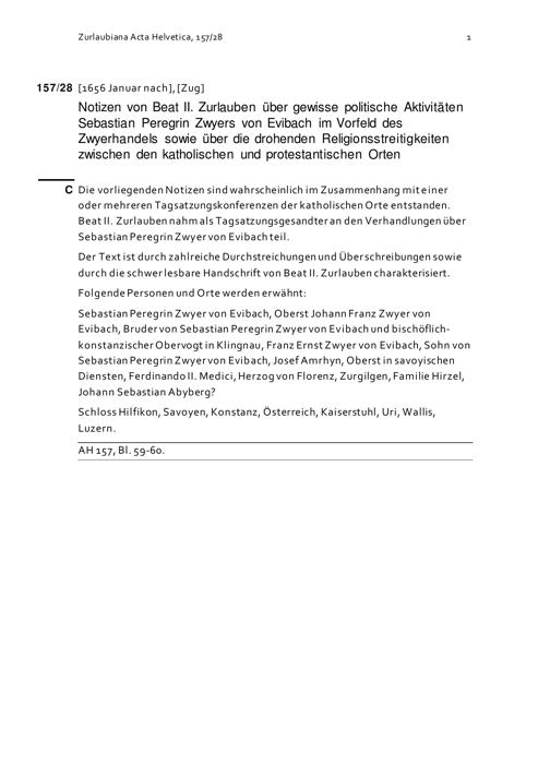Notiz von Beat II. Zurlauben über gewisse politische Aktivitäten von Sebastian Peregrin Zwyer von Evibach im Vorfeld des Zwyerhandels sowie über die drohenden Religionsstreitigkeiten zwischen den katholischen und protestantischen Orten