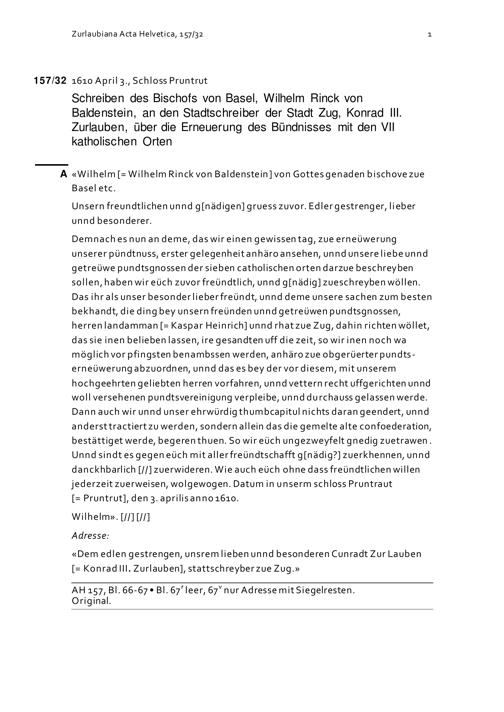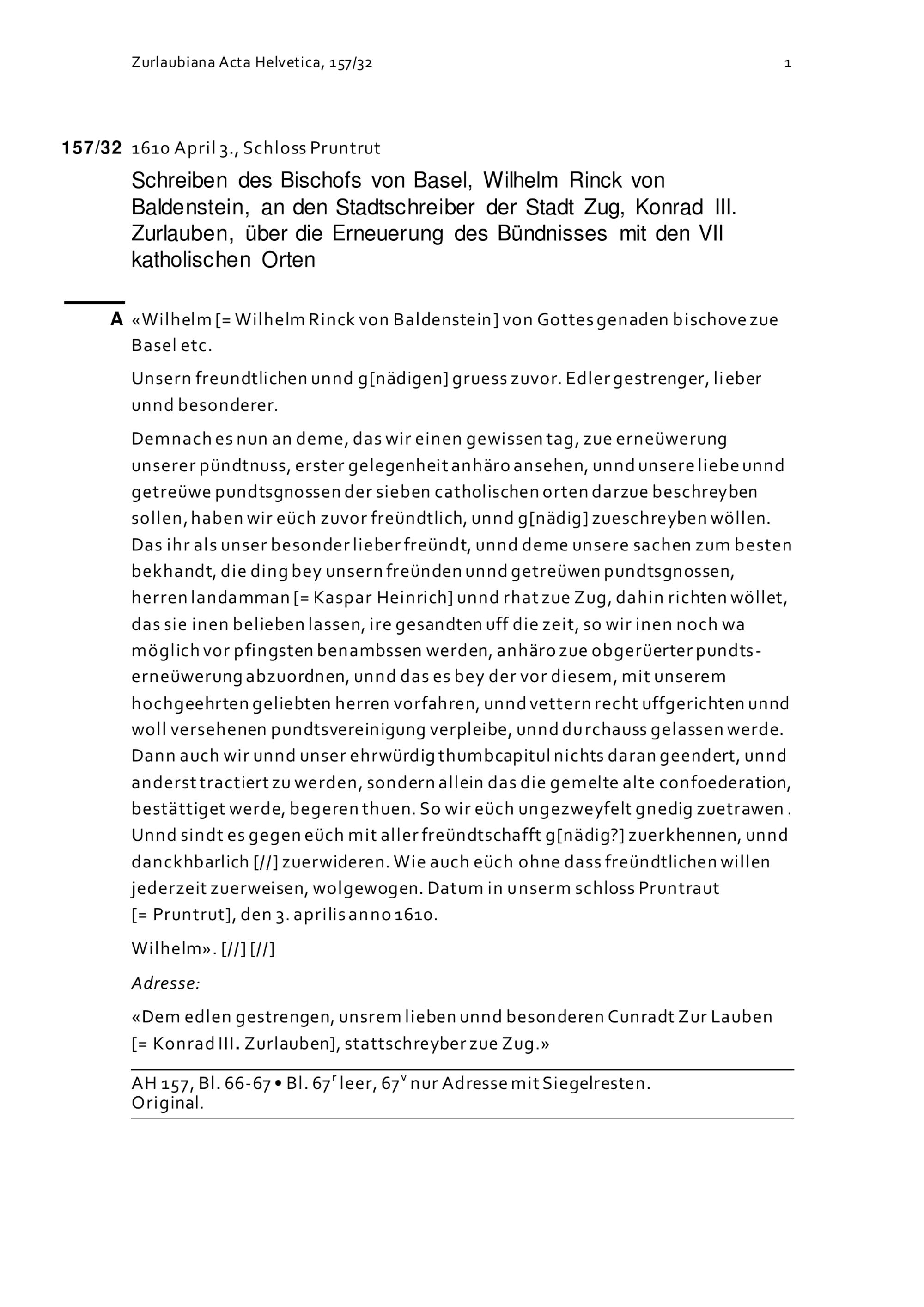 Schreiben von Wilhelm Rinck von Baldenstein, Bischof von Basel, an den Stadtschreiber der Stadt Zug, Konrad III. Zurlauben, über die Erneuerung des Bündnisses mit den Sieben Katholischen Orten