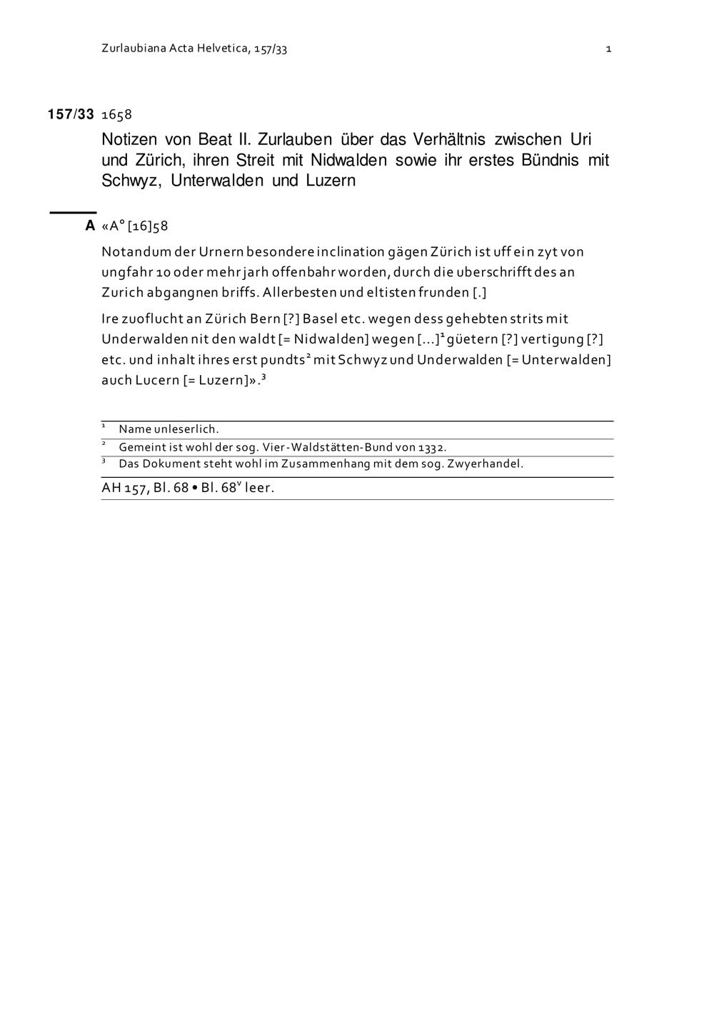 Notiz von Beat II. Zurlauben über das Verhältnis zwischen Uri und Zürich, ihren Streit mit Nidwalden sowie ihr erstes Bündnis mit Schwyz, Unterwalden und Luzern, wohl in Zusammenhang mit dem sogenannten Zwyerhandel