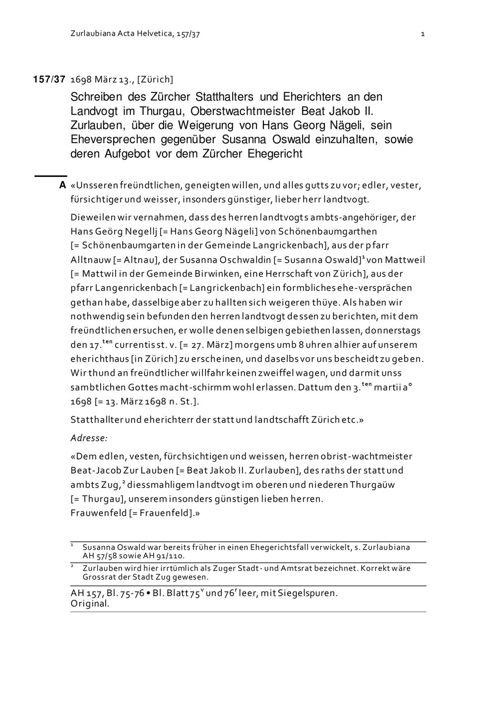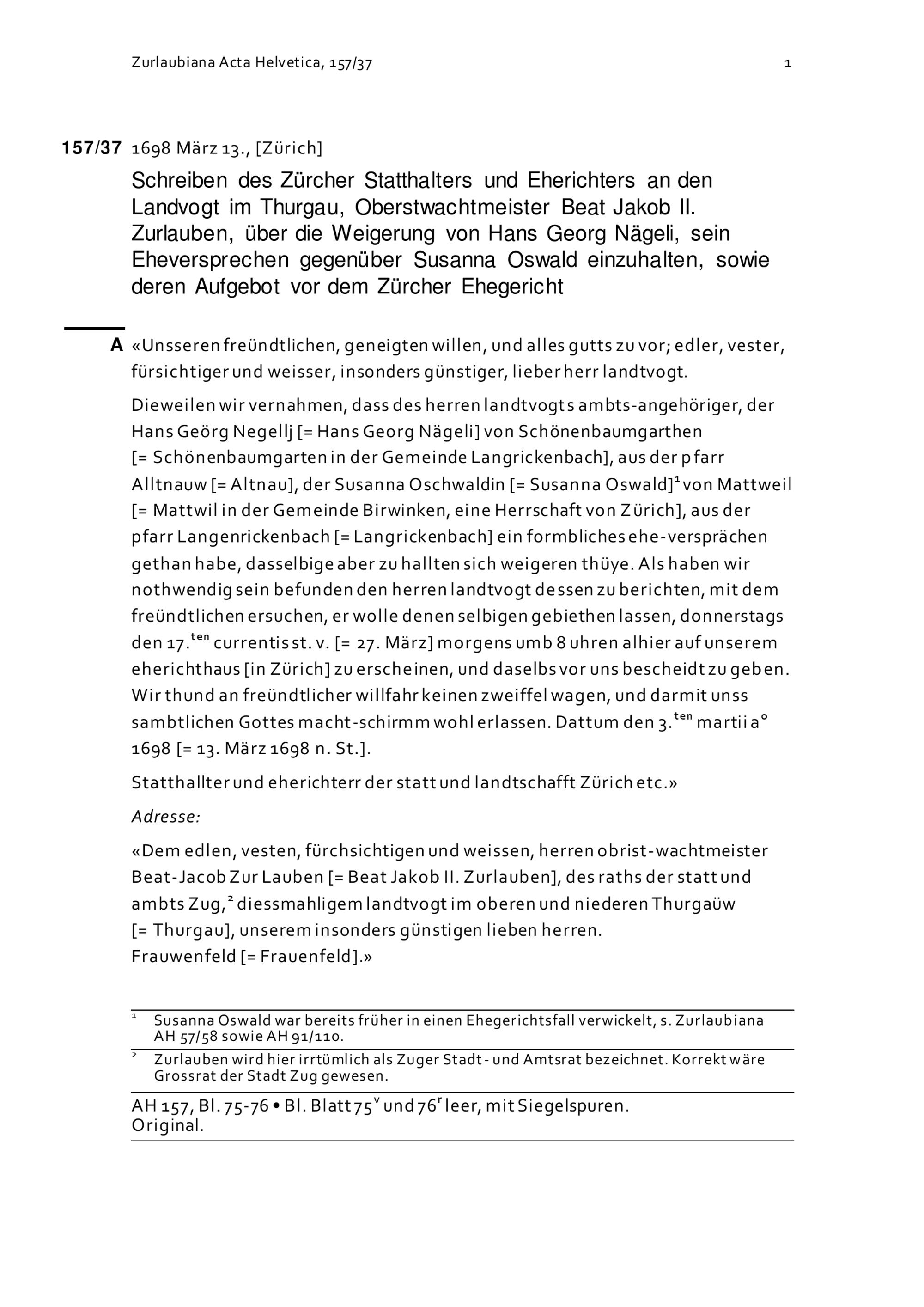 Schreiben des Zürcher Statthalters und Eherichters an Beat Jakob II. Zurlauben, Landvogt im Thurgau, Oberstwachtmeister, über die Weigerung von Hans Georg Nägeli, sein Eheversprechen gegenüber Susanna Oswald einzuhalten, sowie deren Aufgebot vor dem Zürcher Ehegericht