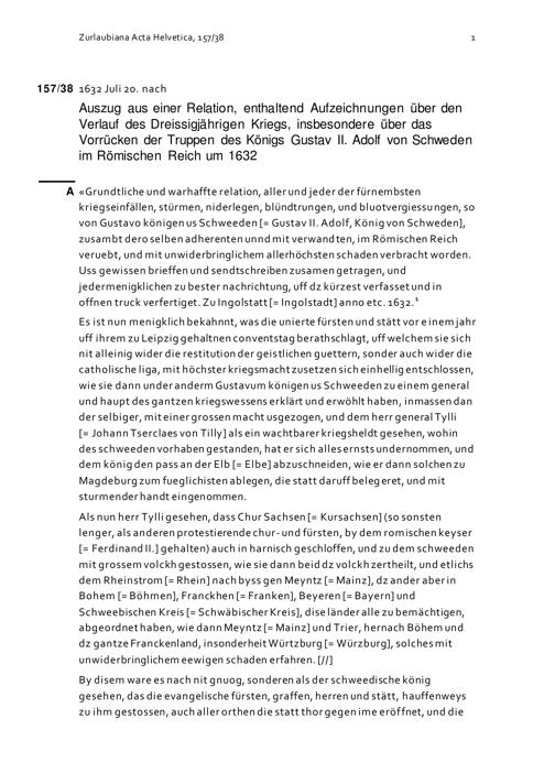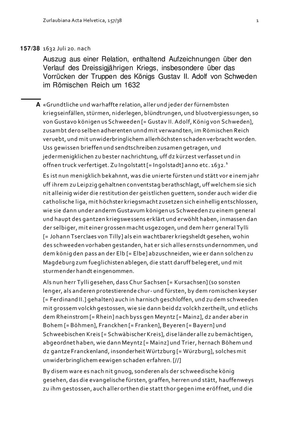 Auszug aus «Grundtliche und warhaffte Relation, aller und jeder der fürnembsten Kriegseinfällen, so von Gustavo, Königen us Schweeden, im Römischen Reich veruebt, zu Ingolstatt (= Ingolstadt] anno etc. 1632», enthaltend Aufzeichnungen über den Verlauf des Dreissigjährigen Kriegs, insbesondere über das Vorrücken der Truppen des Königs Gustav II. Adolf von Schweden im Römischen Reich um 1632 [http://digital.slub-dresden.de/werkansicht/dlf/88500/1]