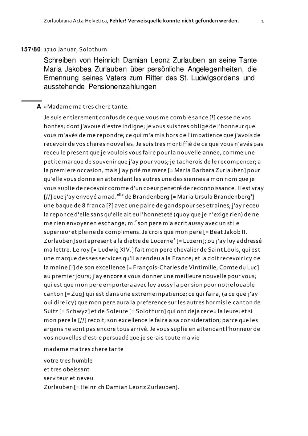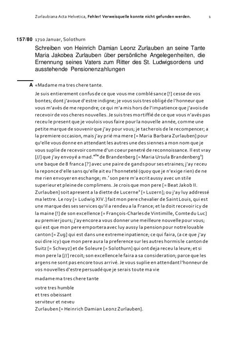 Schreiben von Heinrich Damian Leonz Zurlauben an Maria Jakobea Zurlauben, seine Tante,...