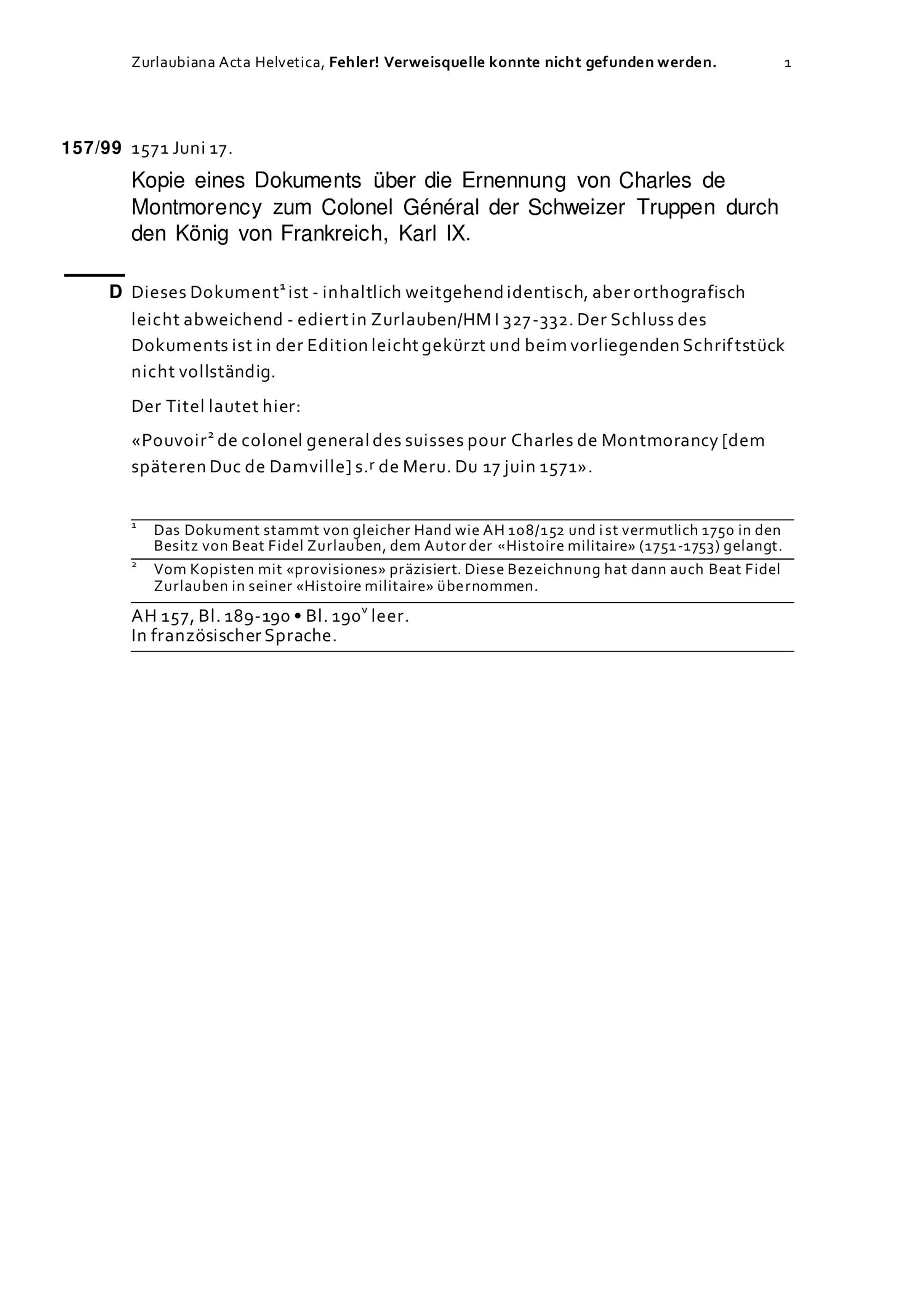 Ernennung von Charles de Montmorency zum Colonel Général der Schweizer Truppen durch den König von Frankreich, Karl IX.