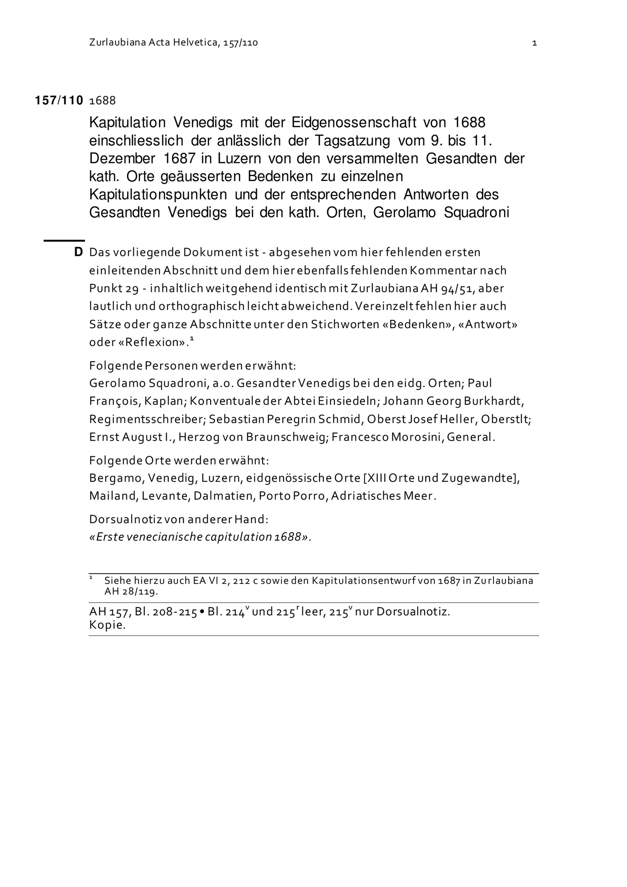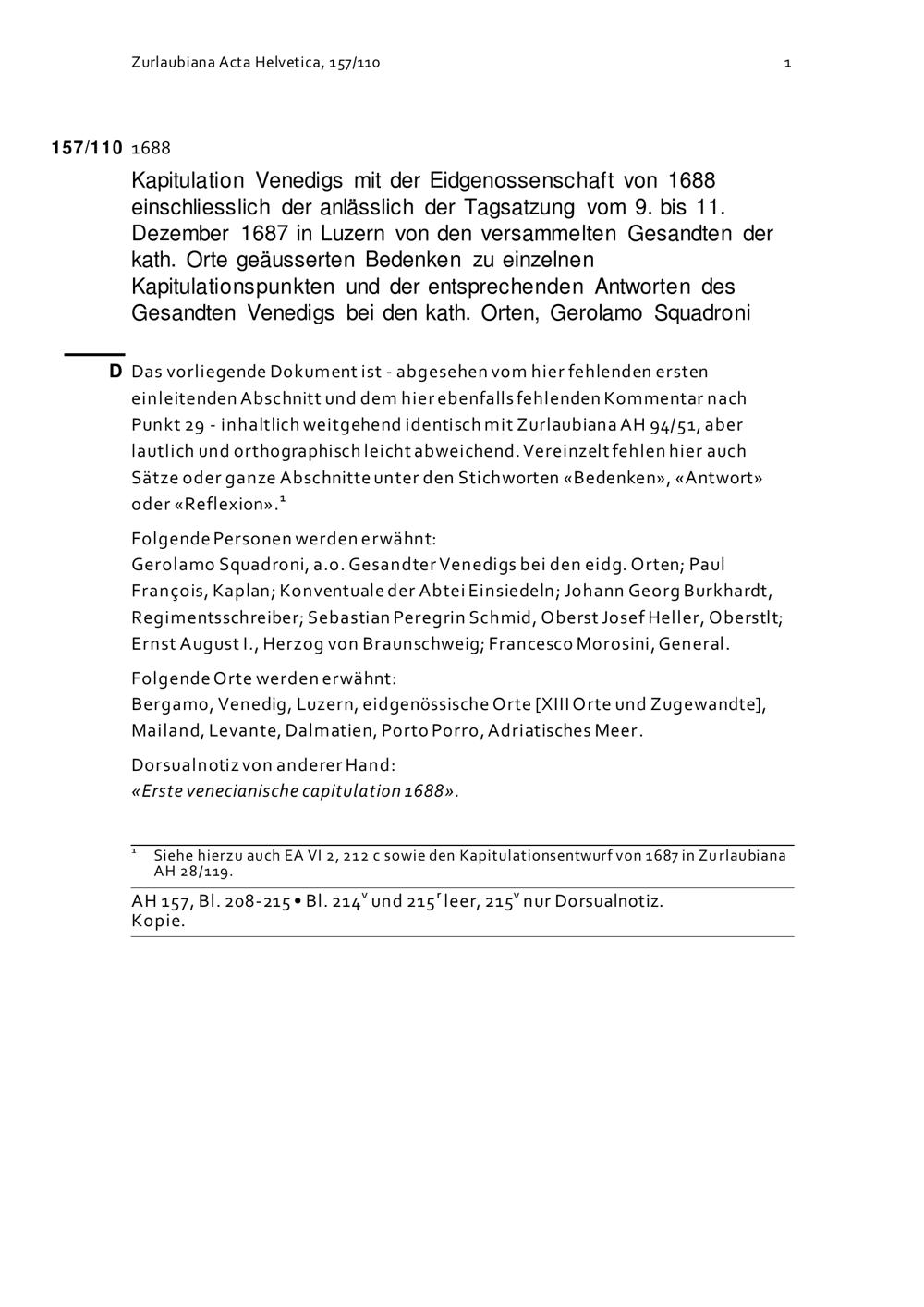Kapitulation Venedigs mit der Eidgenossenschaft von 1688 einschliesslich der anlässlich der Tagsatzung vom 9. bis 11. Dezember 1687 in Luzern von den versammelten Gesandten der Katholischen Orte geäusserten Bedenken zu einzelnen Kapitulationspunkten und der entsprechenden Antworten des Gesandten Venedigs bei den Katholischen Orten, Gerolamo Squadroni