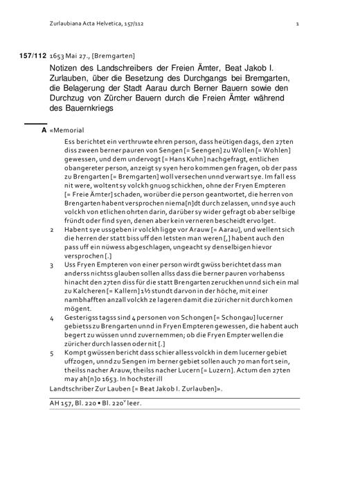 Notiz von Beat Jakob I. Zurlauben, Landschreiber der Freien Ämter, über die Besetzung des Durchgangs bei Bremgarten, die Belagerung der Stadt Aarau durch Berner Bauern sowie den Durchzug von Zürcher Bauern durch die Freien Ämter während des Bauernkriegs