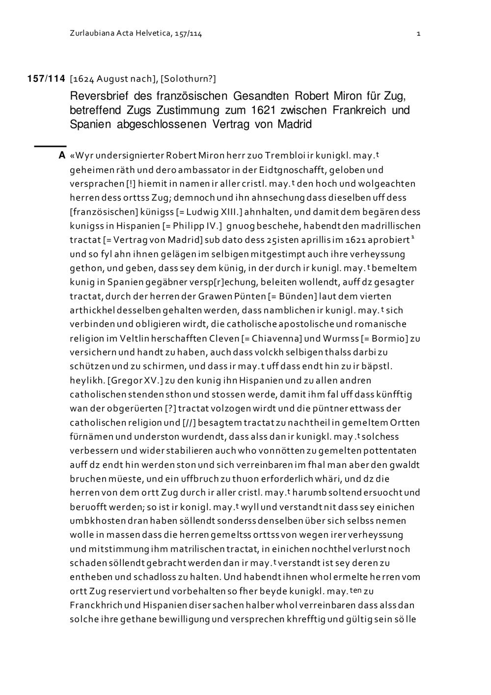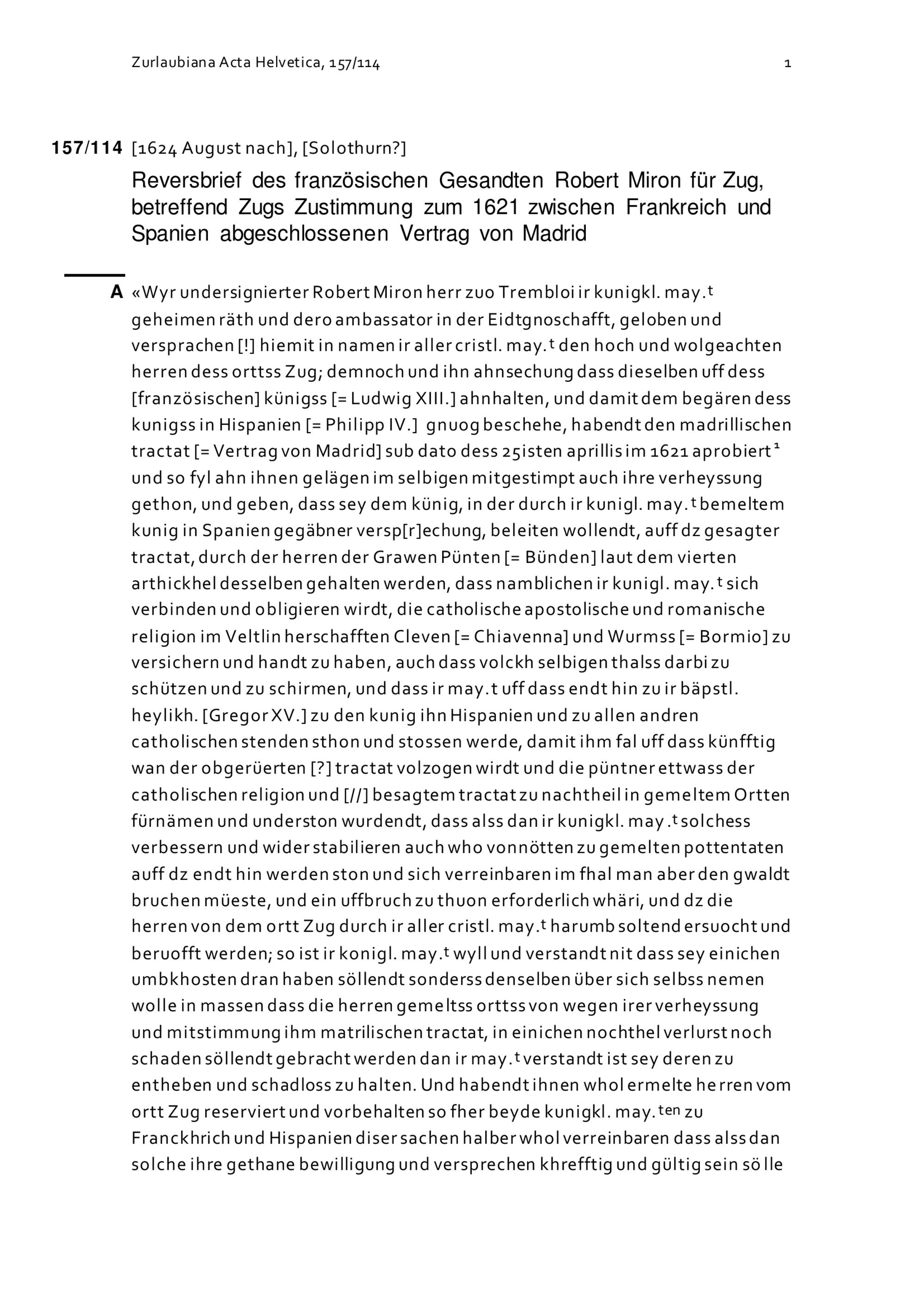 Reversbrief des französischen Gesandten Robert Miron für Zug, betreffend Zugs Zustimmung zum 1621 zwischen Frankreich und Spanien abgeschlossenen Vertrag von Madrid
