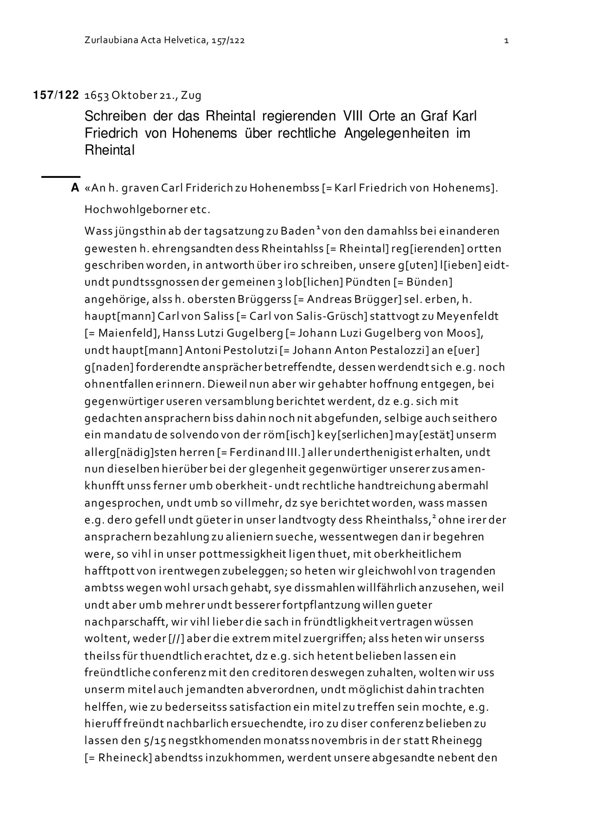 Schreiben der das Rheintal regierenden Acht Orte an Graf Karl Friedrich von Hohenems...