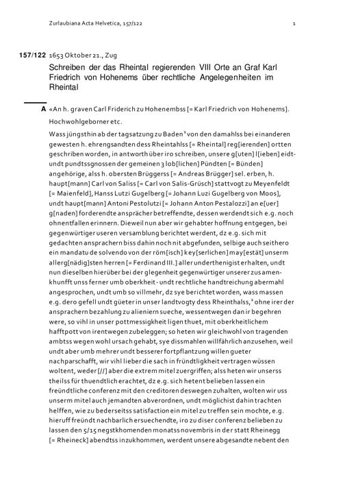 Schreiben der das Rheintal regierenden Acht Orte an Graf Karl Friedrich von Hohenems über rechtliche Angelegenheiten im Rheintal