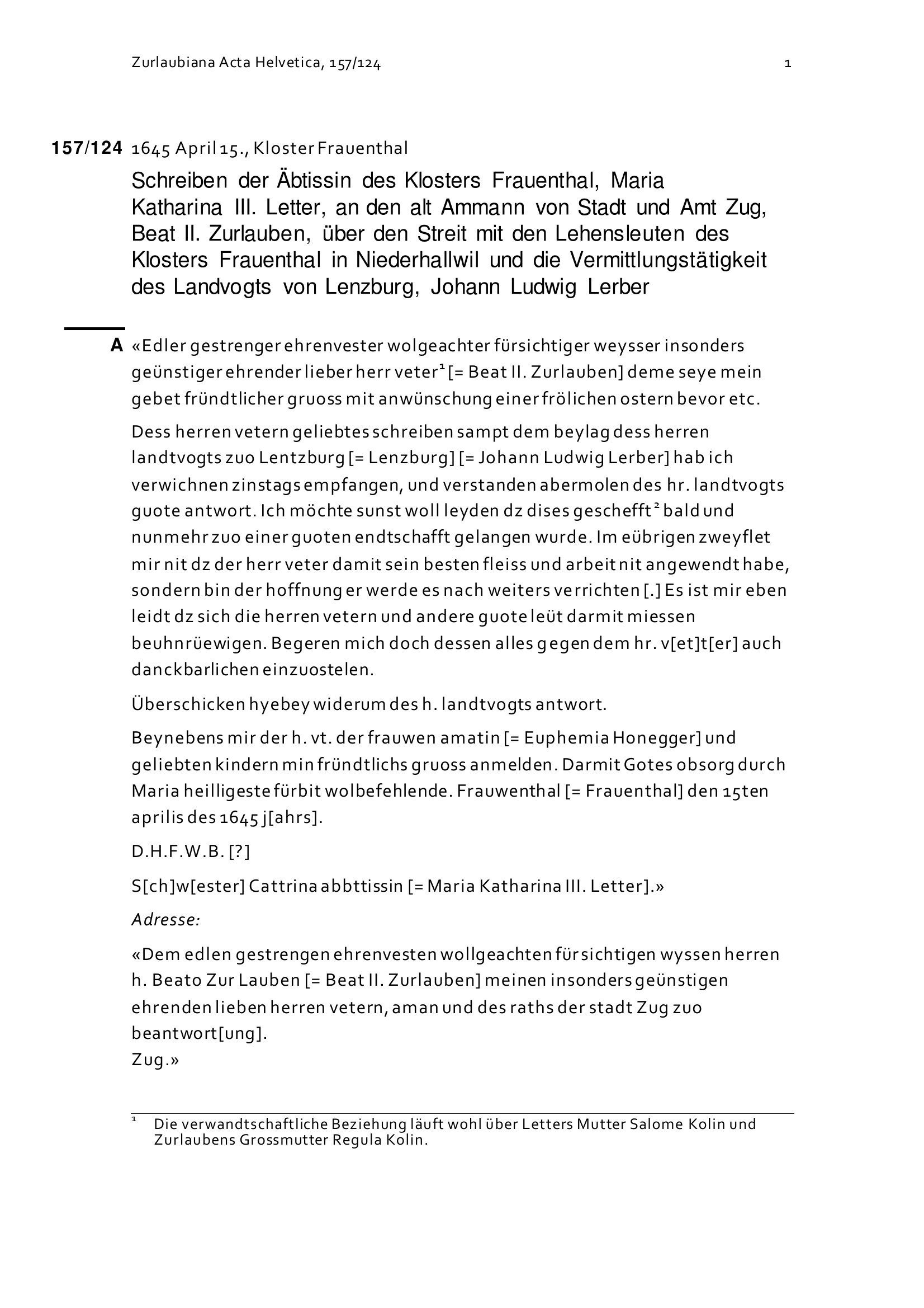 Schreiben von Maria Katharina III. Letter, Äbtissin des Frauenklosters Frauenthal, an Beat II. Zurlauben, Ammann, über den Streit mit den Lehensleuten des Frauenklosters Frauenthal in Niederhallwil und die Vermittlungstätigkeit des Landvogts von Lenzburg, Johann Ludwig Lerber