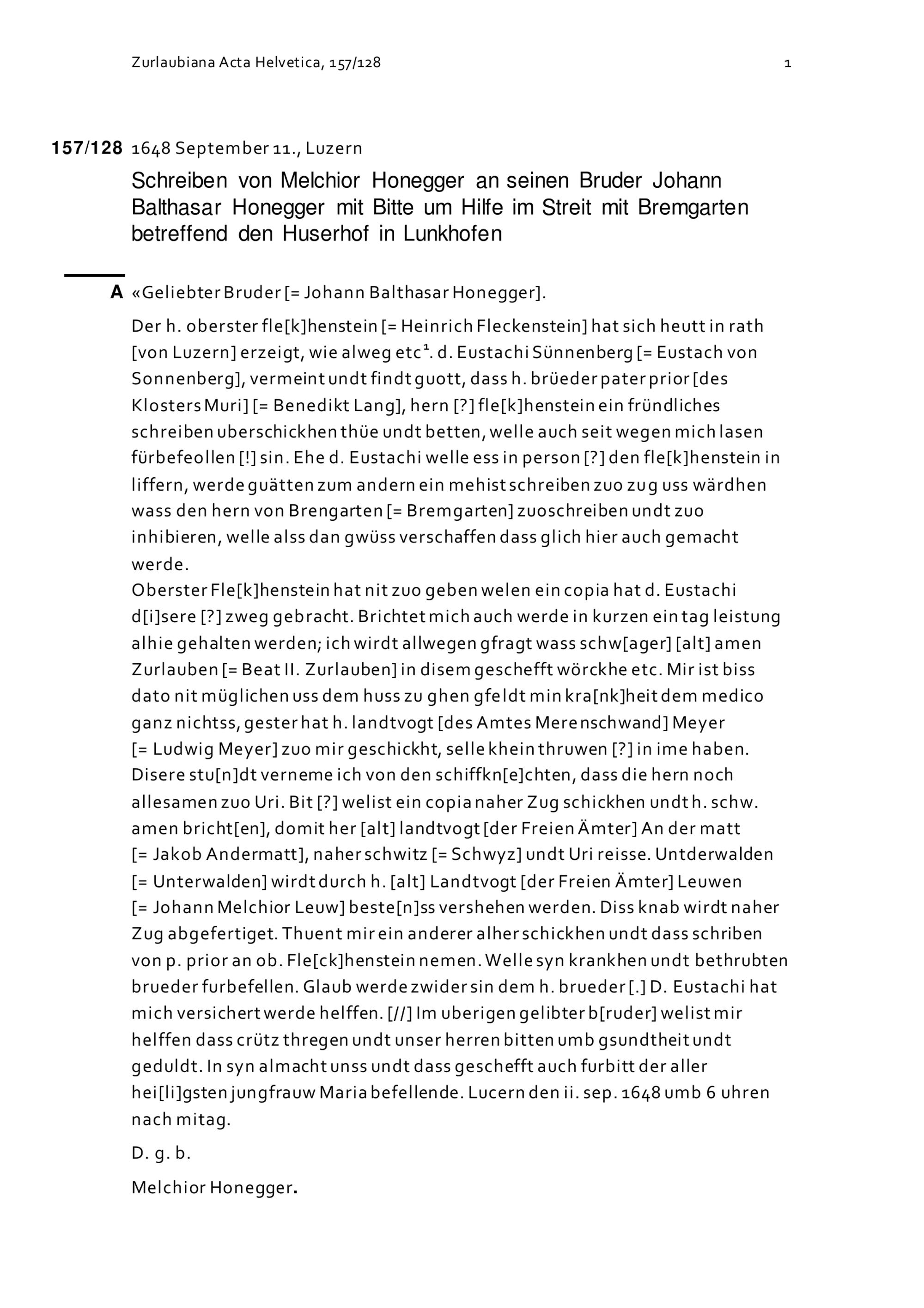 Schreiben von Melchior Honegger an Johann Balthasar Honegger, seinen Bruder, mit Bitte um Hilfe im Streit mit Bremgarten betreffend den Huserhof in Lunkhofen