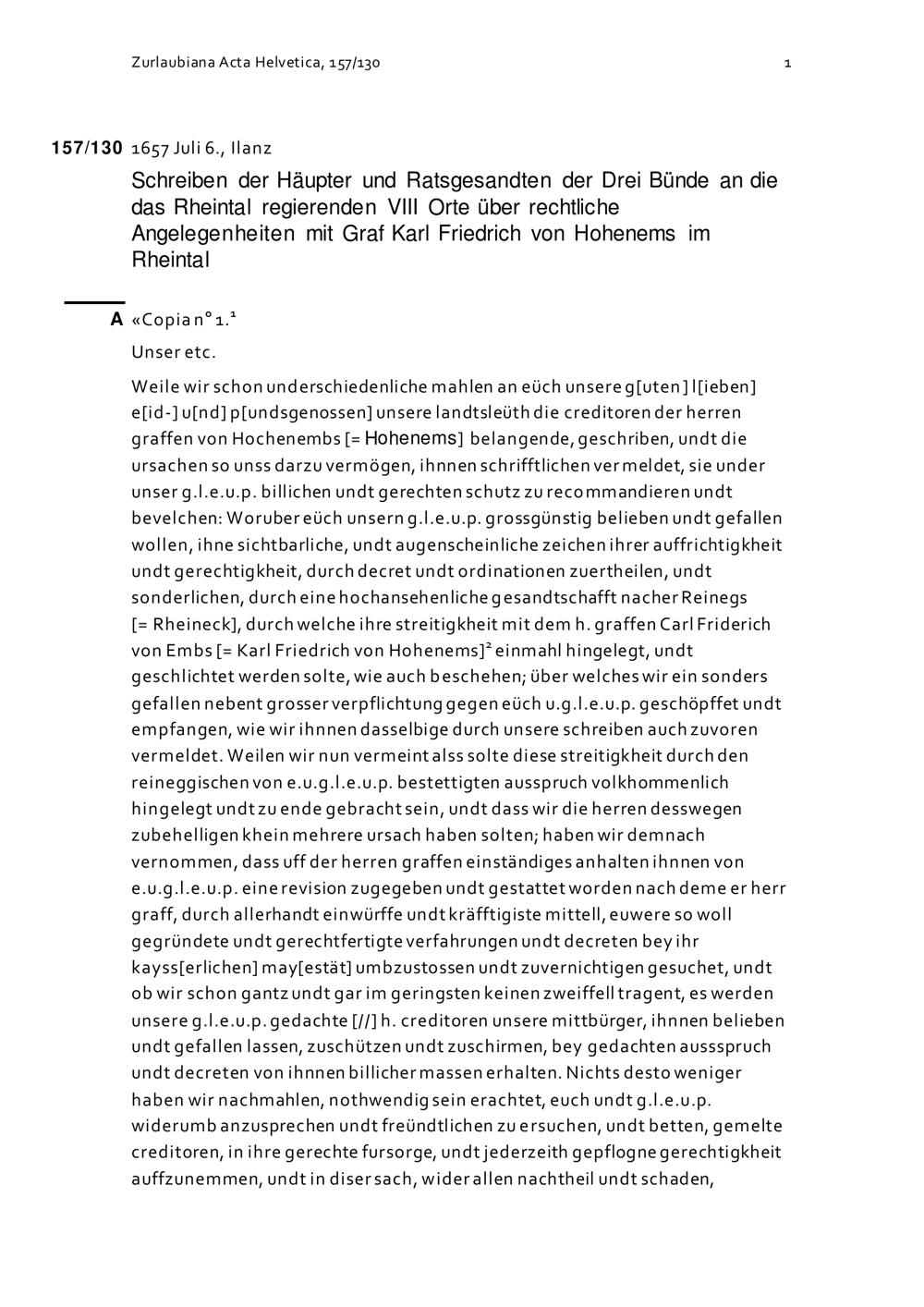 Schreiben der Häupter und Ratsgesandten der Drei Bünde an die das Rheintal regierenden Acht Orte über rechtliche Angelegenheiten mit Graf Karl Friedrich von Hohenems im Rheintal