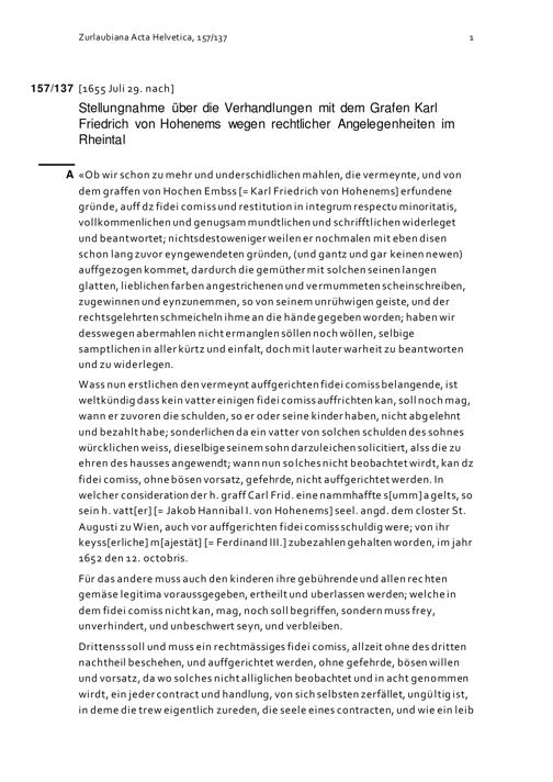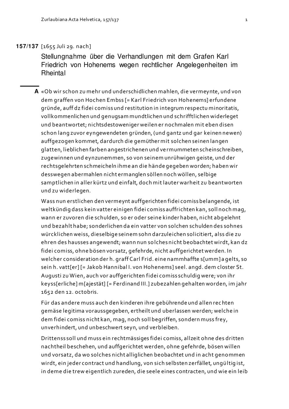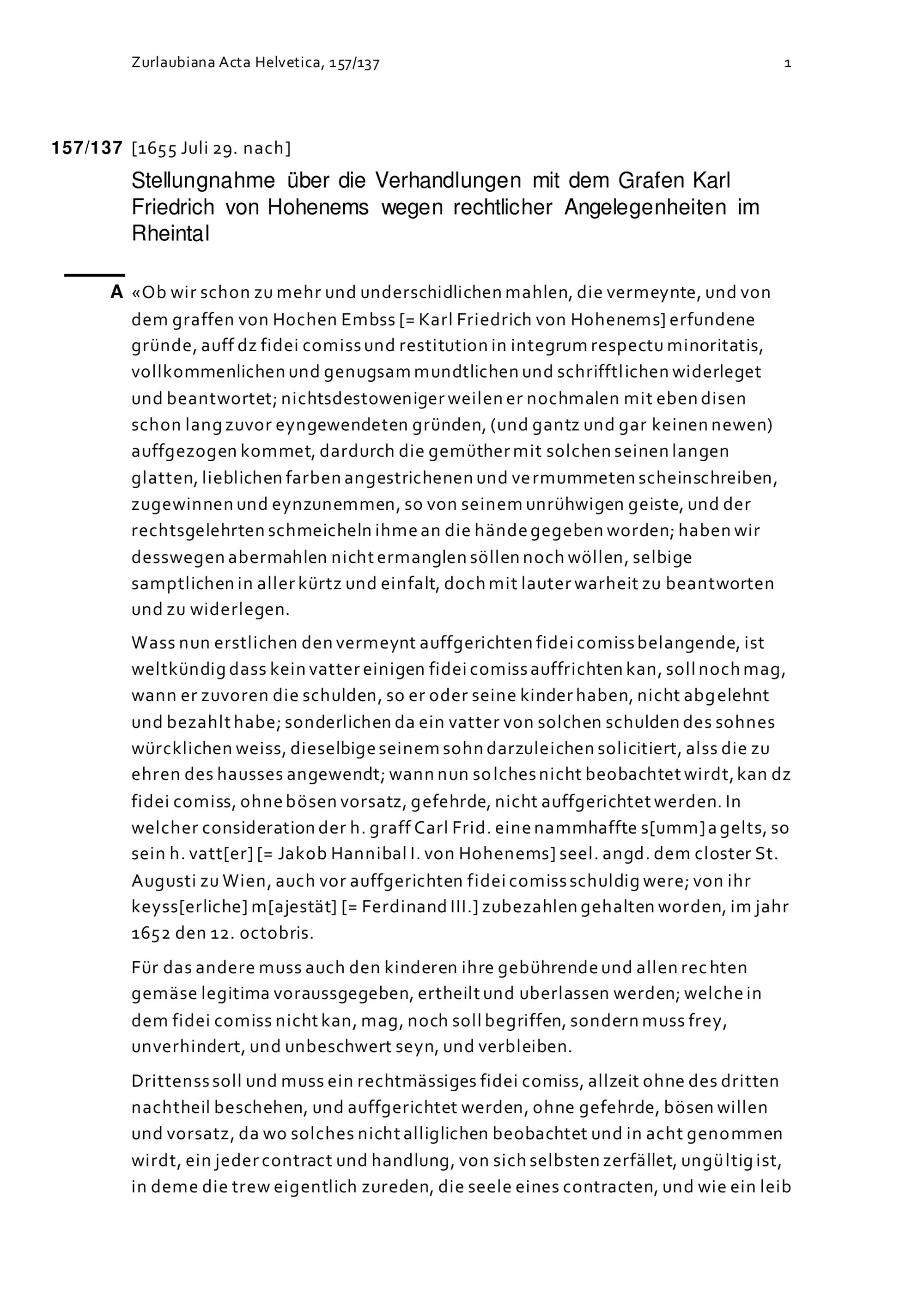 Stellungnahme der das Rheintal regierenden Acht Orte über die Verhandlungen mit Karl Friedrich von Hohenems, Graf, wegen rechtlicher Angelegenheiten im Rheintal