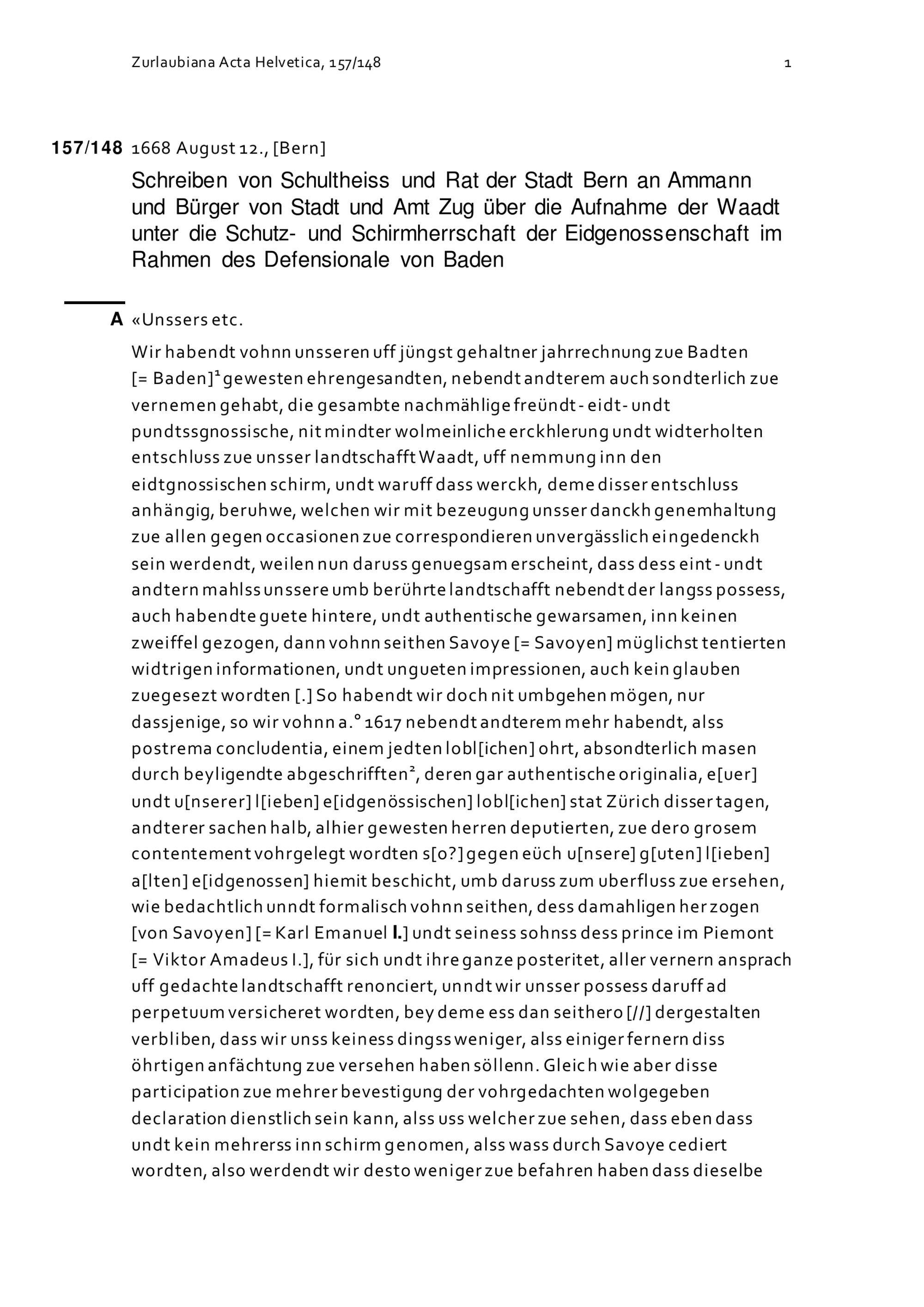 Schreiben des Schultheiss und Rats der Stadt Bern an Ammann und Bürger von Stadt und Amt Zug über die Aufnahme der Waadt unter die Schutz- und Schirmherrschaft der Eidgenossenschaft im Rahmen des Defensionale von Baden