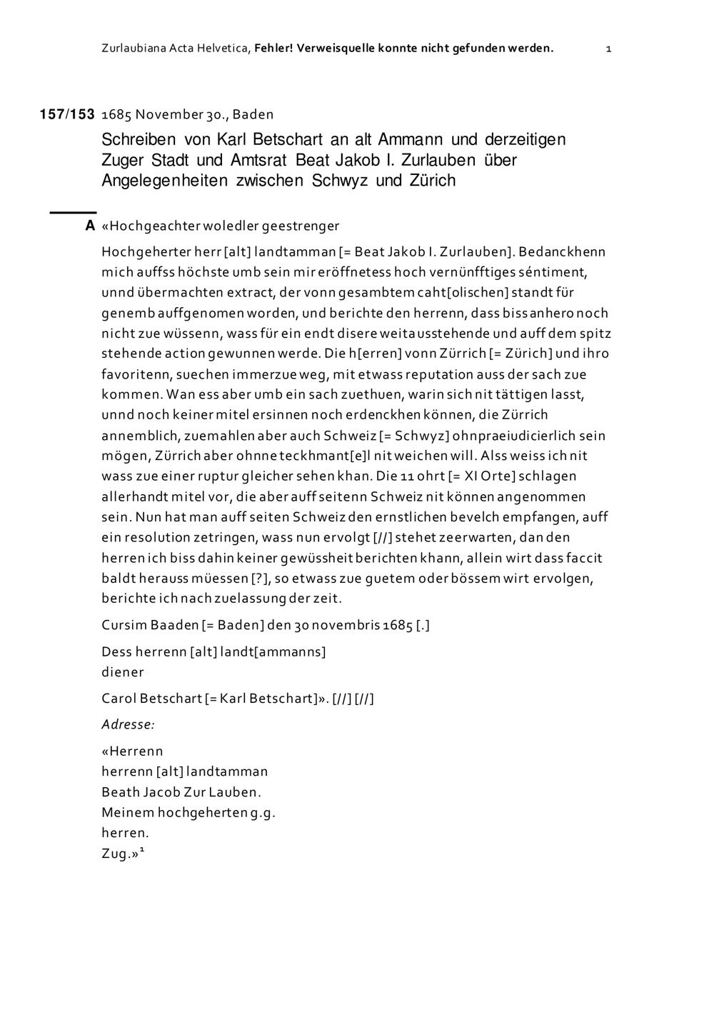 Schreiben von Karl Betschart an Beat Jakob I. Zurlauben, Altammann und Zuger Stadt...