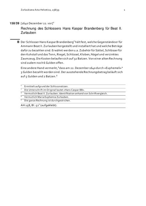Rechnung des Schlossers Hans Kaspar Brandenberg für Beat II. Zurlauben