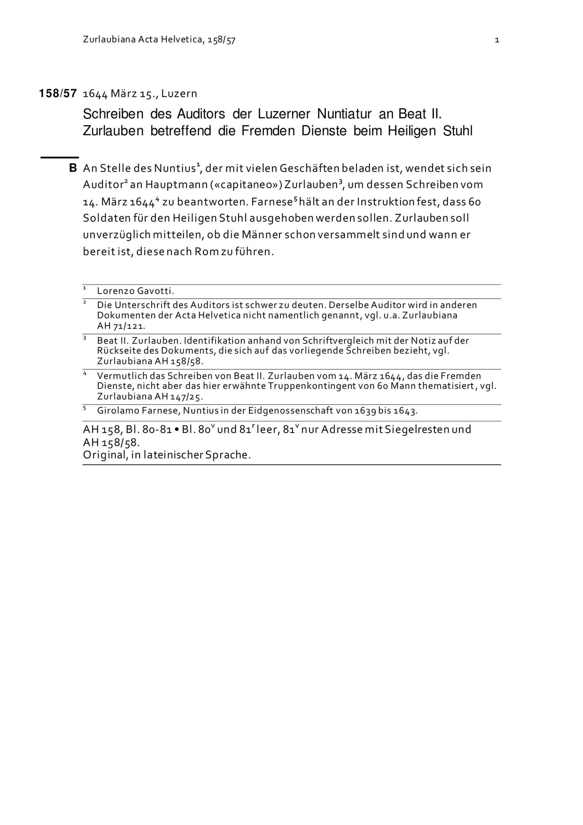 Schreiben des Auditors der Luzerner Nuntiatur an Beat II. Zurlauben betreffend die Fremden Dienste beim Heiligen Stuhl