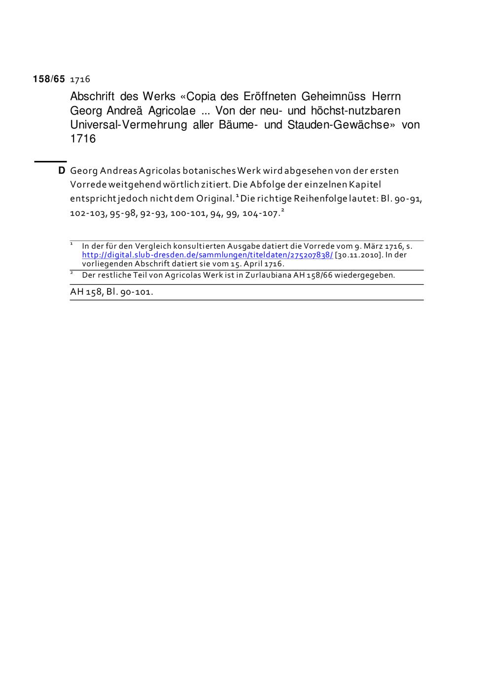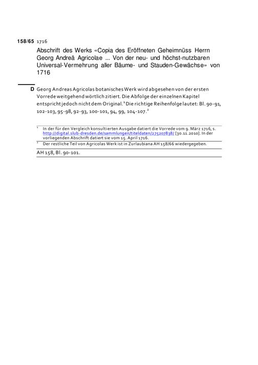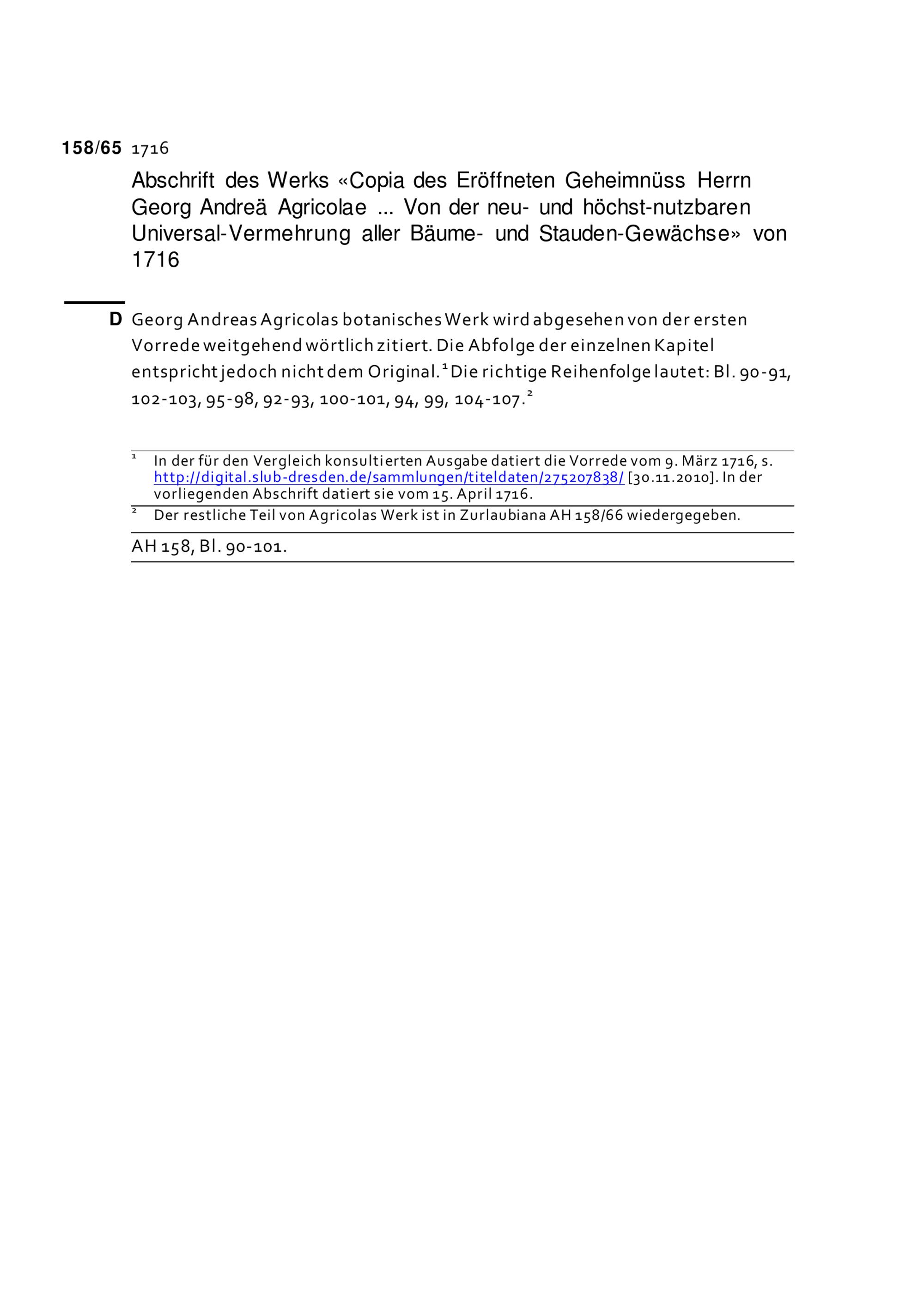 Abschrift des Werks «Copia des eröffneten Geheimnüss Herrn Georg Andreae Agricolae, Phil. & Medic. Doct. nec non Physic. Ord. in der freyen Stadt Regenspurg, von neu- und höchst-nutzbaren Universal-Vermehrung aller Bäume- und Stauden-Gewächse» Regensburg, 1716