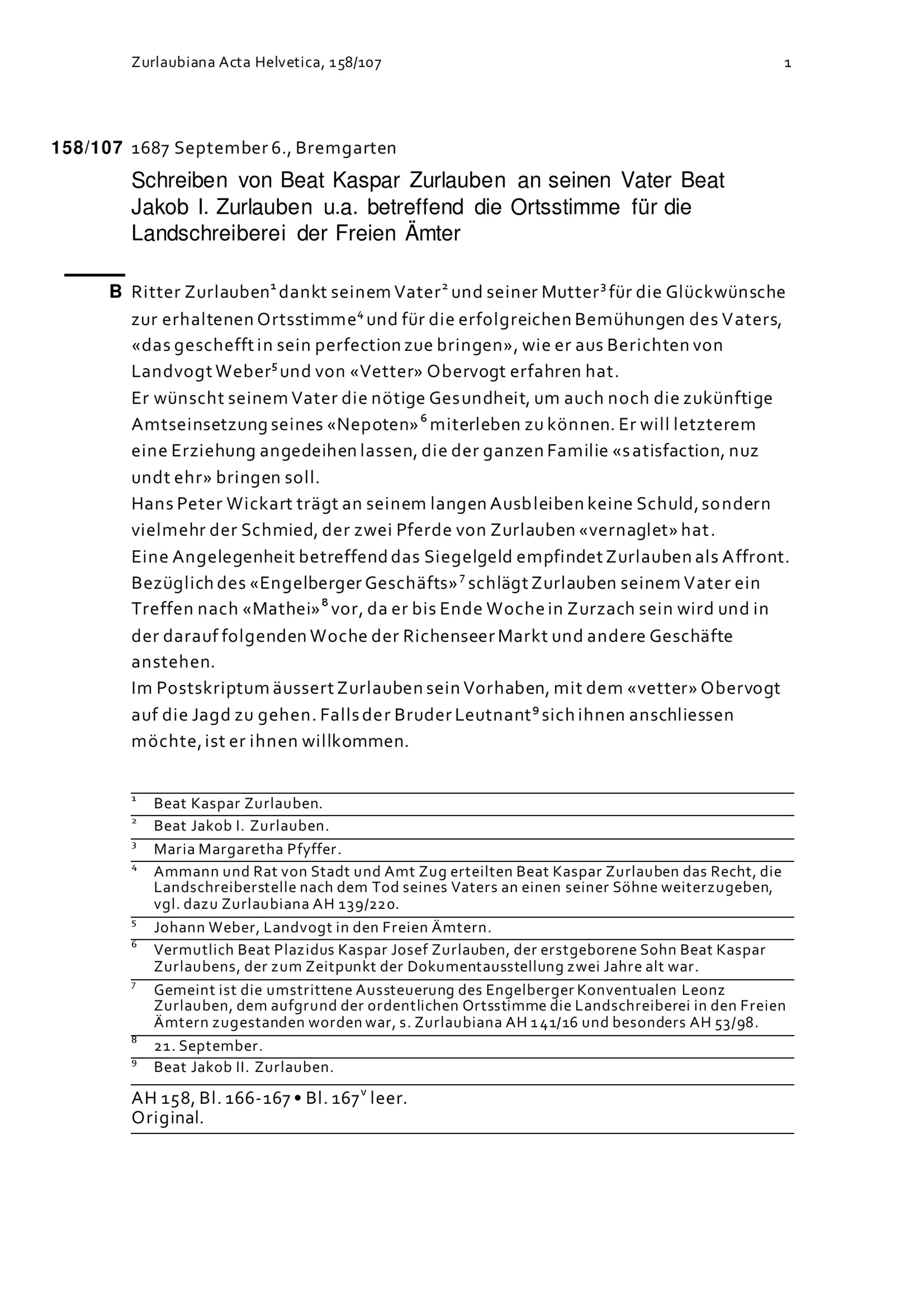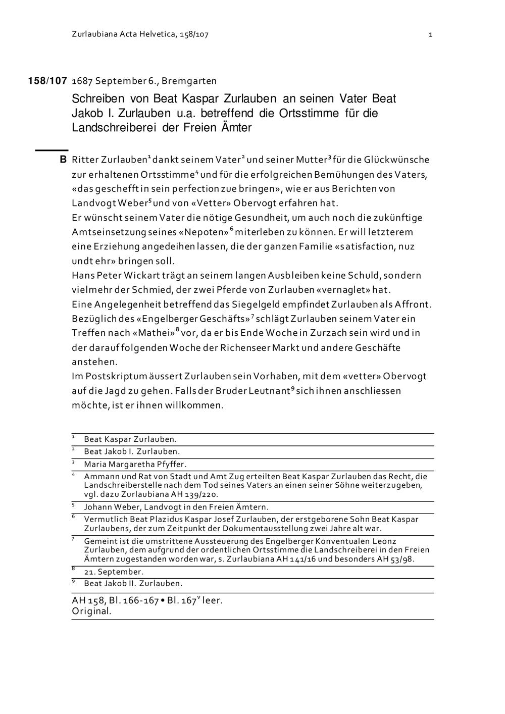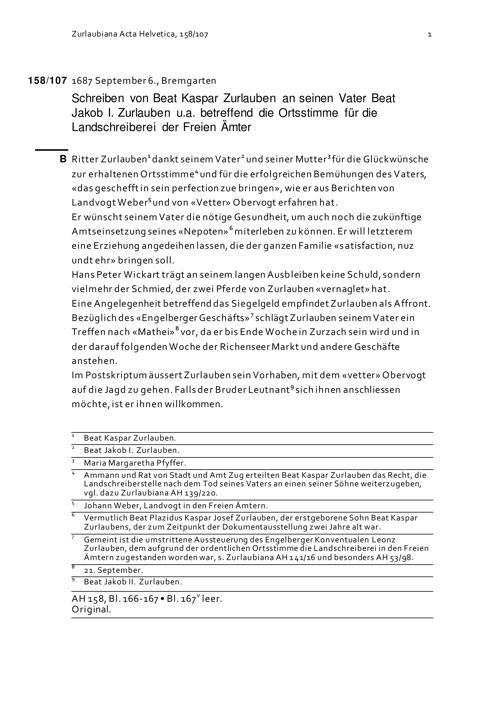 Schreiben von Beat Kaspar Zurlauben an Beat Jakob I. Zurlauben, seinen Vater, u.a. betreffend die Ortsstimme für die Landschreiberei der Freien Ämter