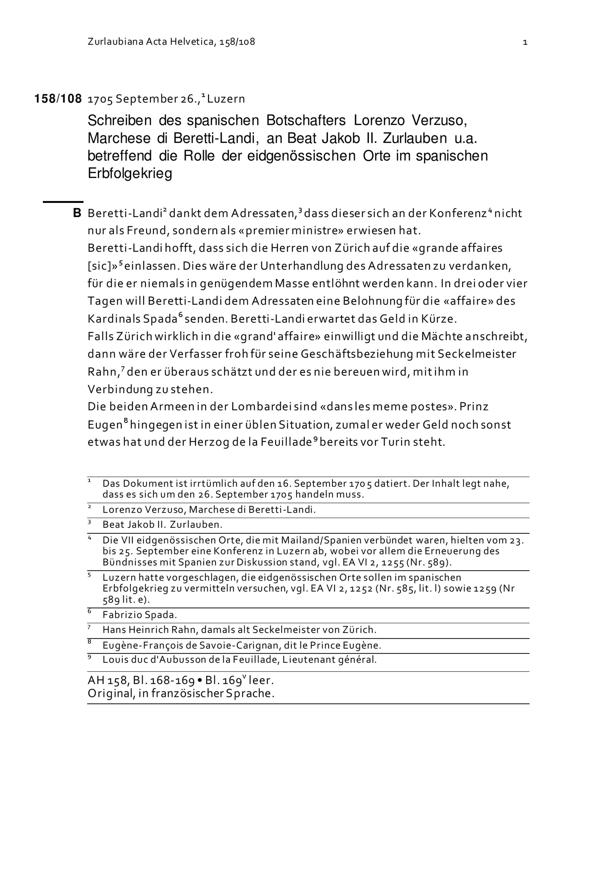 Schreiben von Lorenzo Verzuso, Marchese di Beretti-Landi, Ambassador von Spanien, an Beat Jakob II. Zurlauben unter anderem betreffend die Rolle der eidgenössischen Orte im spanischen Erbfolgekrieg