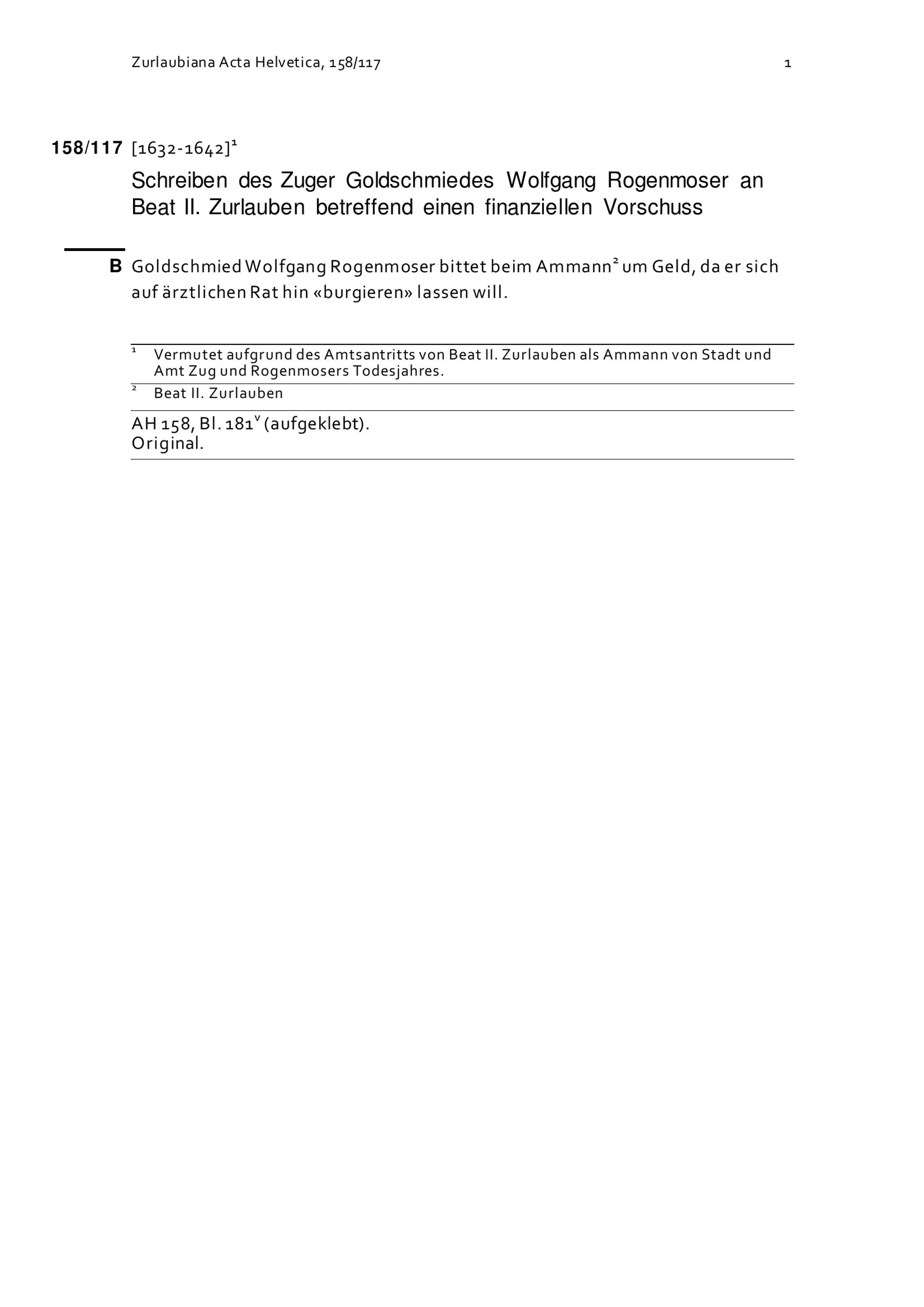 Schreiben von Wolfgang Rogenmoser, Zuger Goldschmied, an Beat II. Zurlauben betreffend einen finanziellen Vorschuss