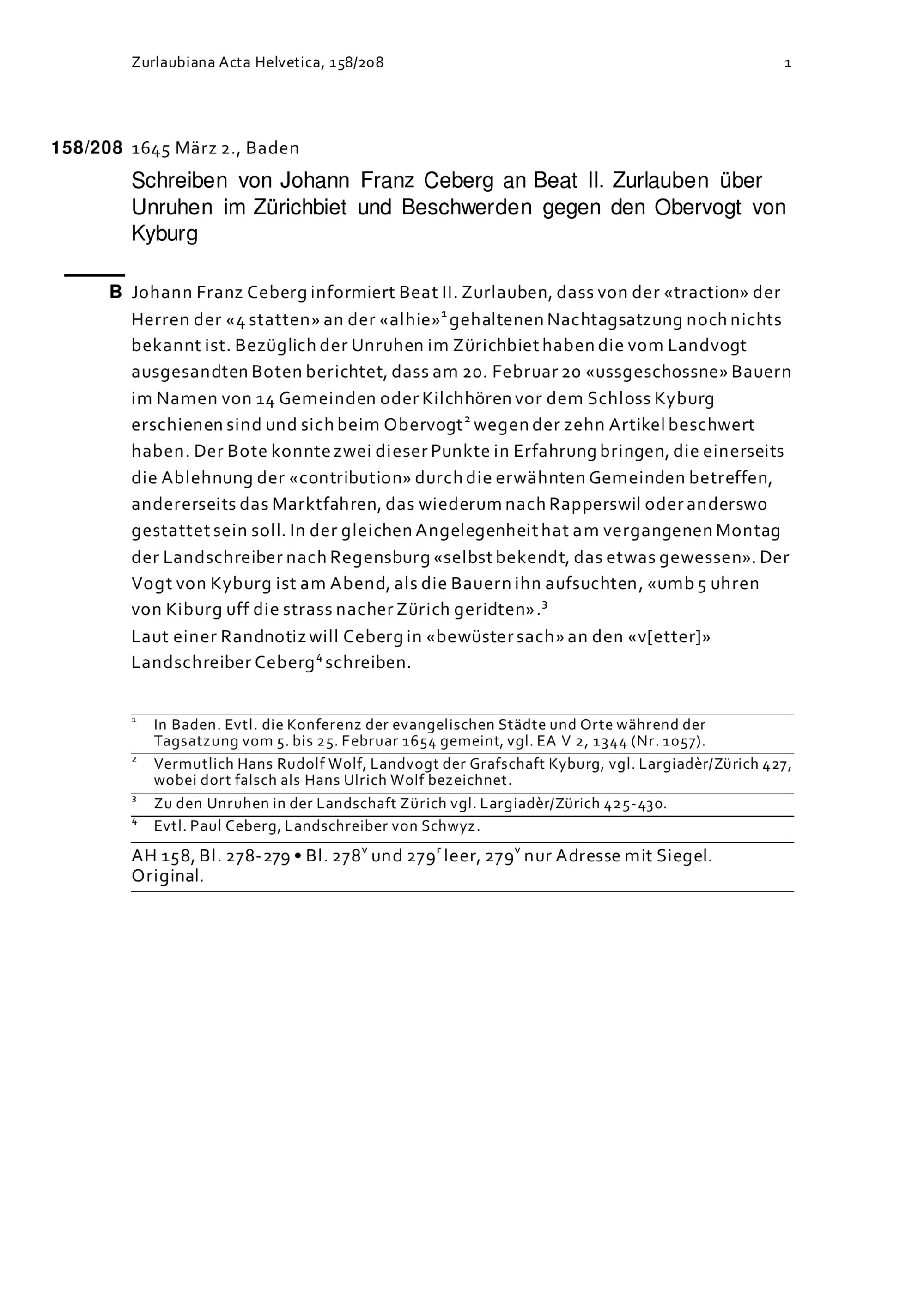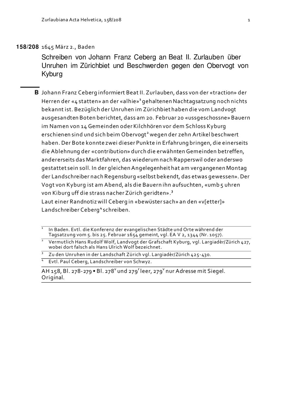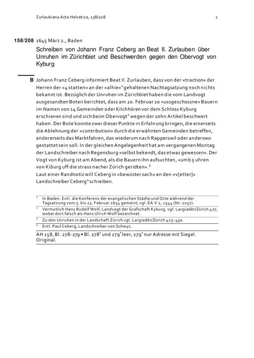 Schreiben von Johann Franz Ceberg an Beat II. Zurlauben über Unruhen im Zürichbiet...