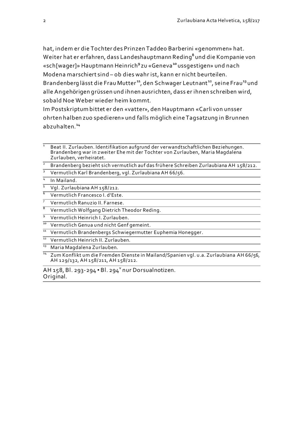 Schreiben von Kaspar Brandenberg an Beat II. Zurlauben mit Klagen über Gesandte in Zusammenhang mit Pensionengeldern für die Fremden Dienste in Mailand-Spanien