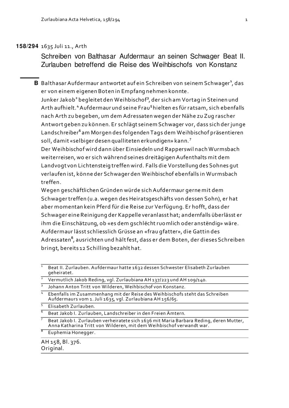 Schreiben von Balthasar Aufdermaur an Beat II. Zurlauben, seinen Schwager, betreffend die Reise des Weihbischofs von Konstanz