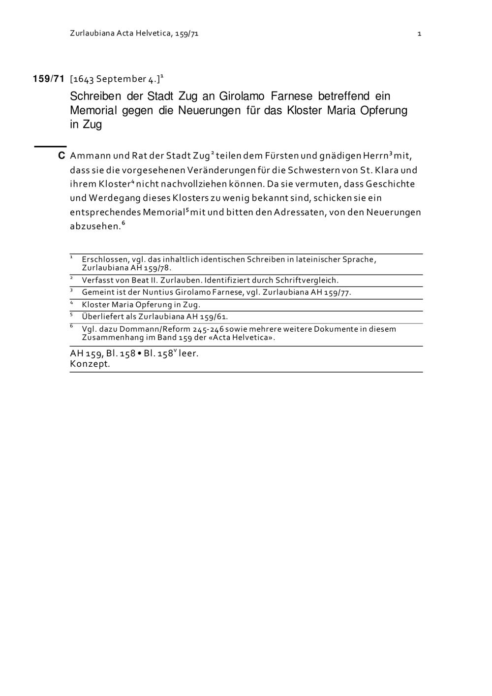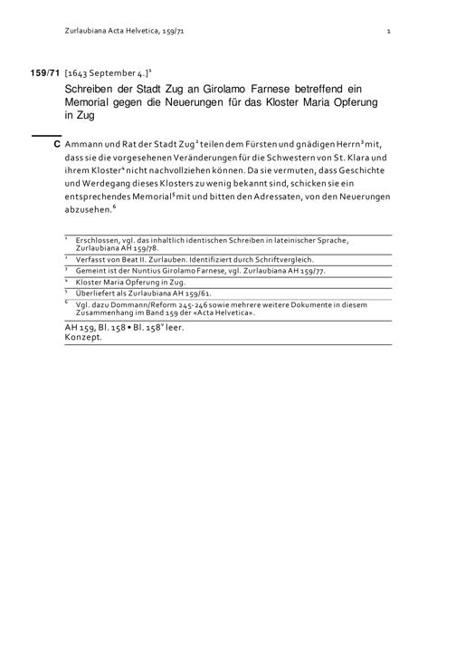 Schreiben der Stadt Zug an Girolamo Farnese, Nuntius, betreffend ein Memorial gegen die Neuerungen für das Kloster Maria Opferung in Zug