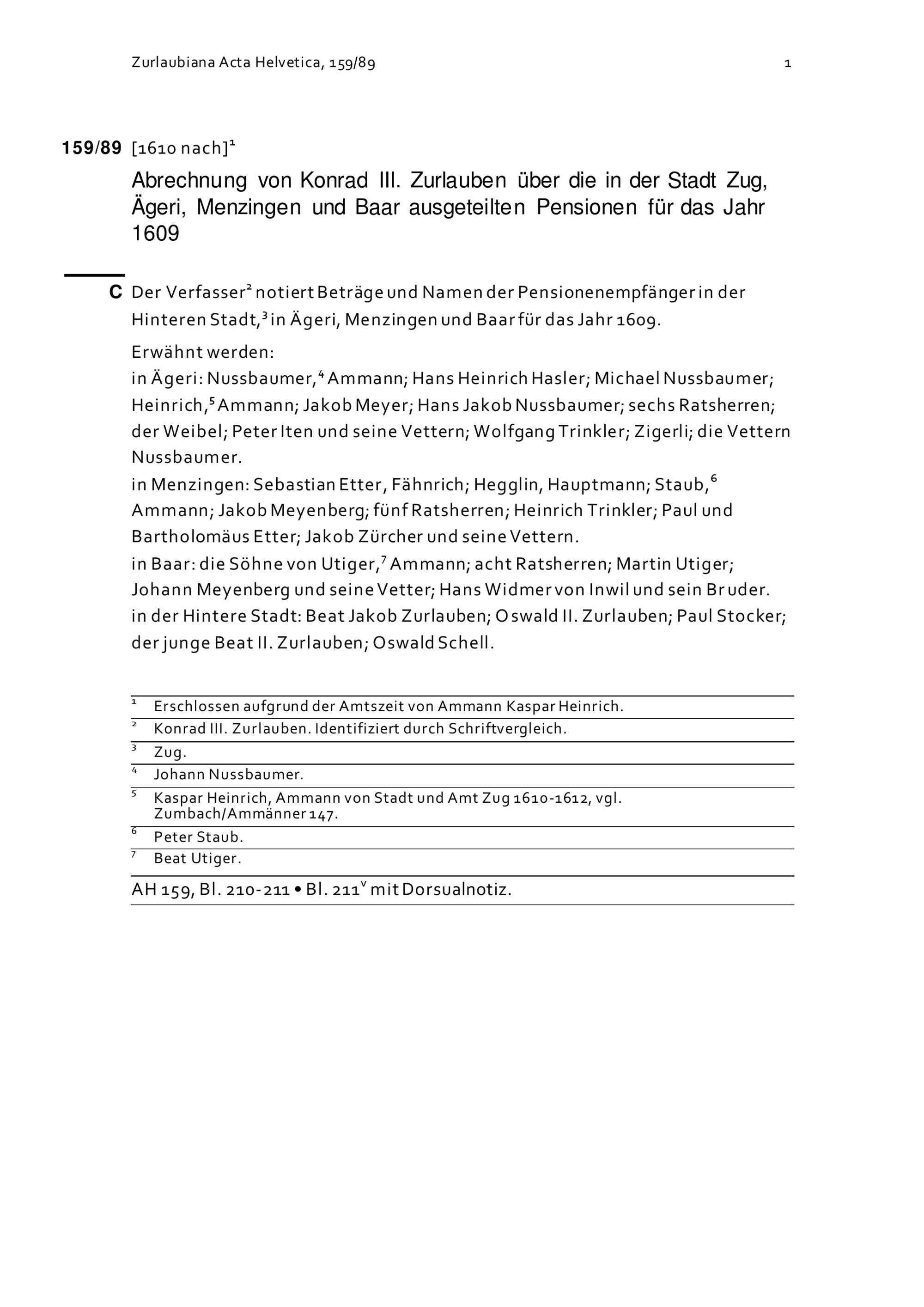 Abrechnung von Konrad III. Zurlauben über in der Stadt Zug und in Ägeri, Menzingen und Baar ausgeteilte Pensionen