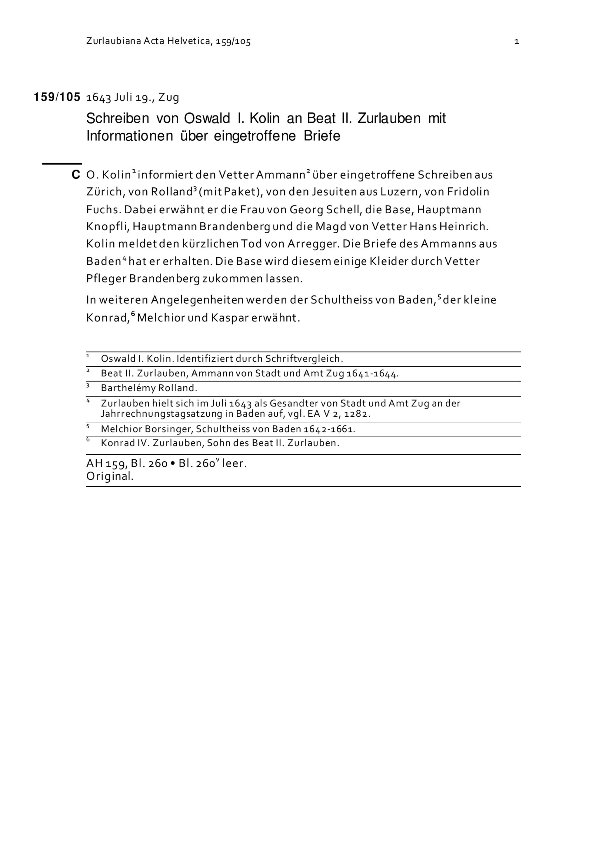 Schreiben von Oswald I. Kolin an Beat II. Zurlauben . mit Informationen über eingetroffene Briefe